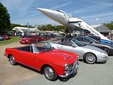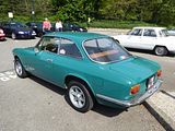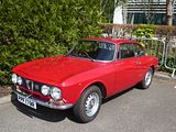 Far more numerous were the Coupe models, with plenty of examples of this much loved, and now highly valued car on display. The first car was called the Alfa Romeo Giulia Sprint GT, and was revealed at a press event held at the then newly opened Arese plant on 9 September 1963, and displayed later the same month at the Frankfurt Motor Show. In its original form the Bertone body is known as scalino (step) or “step front”, because of the leading edge of the engine compartment lid which sat 1/4 an inch above the nose of the car. The Giulia Sprint GT can be distinguished from the later models by a number of features including: Exterior badging: Alfa Romeo logo on the front grille, a chrome script reading “Giulia Sprint GT” on the boot lid, and rectangular “Disegno di Bertone” badges aft of the front wheel arches; flat, chrome grille in plain, wide rectangular mesh without additional chrome bars; single-piece chrome bumpers; no overriders. Inside the cabin the padded vinyl dashboard was characterised by a concave horizontal fascia, finished in grey anti-glare crackle-effect paint. Four round instruments were inset in the fascia in front of the driver. The steering wheel was non-dished, with three aluminium spokes, a thin bakelite rim and a centre horn button. Vinyl-covered seats with cloth centres and a fully carpeted floor were standard, while leather upholstery was an extra-cost option. After initially marketing it as a four-seater, Alfa Romeo soon changed its definition of the car to a more realistic 2+2. The Giulia Sprint GT was fitted with the 1,570 cc version of Alfa Romeo’s all-aluminium twin cam inline four (78 mm bore × 82 mm stroke), which had first debuted on the 1962 Giulia Berlina. Breathing through two twin-choke Weber 40 DCOE 4 carburettors, on the Sprint GT this engine produced 105 hp at 6,000 rpm. Like all subsequent models, the Sprint GT was equipped with an all-synchromesh 5-speed manual transmission. The braking system comprised four Dunlop disc brakes and a vacuum servo. The rear brakes featured an unusual arrangement with the slave cylinders mounted on the axle tubes, operating the calipers by a system of levers and cranks. According to Alfa Romeo the car could reach a top speed of “over 180 km/h (112 mph)”. In total 21,902 Giulia Sprint GT were produced from 1963 to 1965, when the model was superseded by the Giulia Sprint GT Veloce. Of these 2,274 were right hand drive: 1,354 cars fully finished in Arese, and 920 shipped in complete knock-down kit form for foreign assembly. For 1966, the Giulia Sprint GT was replaced by the Alfa Romeo Giulia Sprint GT Veloce, which was very similar but featuring a number of improvements: a revised engine—slightly more powerful and with more torque—better interior fittings and changes to the exterior trim. Alongside the brand new 1750 Spider Veloce which shared its updated engine the Sprint GT Veloce was introduced at the 36th Geneva Motor Show in March 1966, and then tested by the international specialist press in Gardone on the Garda Lake. Production had began in 1965 and ended in 1968. The Giulia Sprint GT Veloce can be most easily distinguished from other models by the following features: badging as per Giulia Sprint GT, with the addition of round enamel badges on the C-pillar—a green Quadrifoglio (four-leaf clover) on an ivory background—and a chrome “Veloce” script on the tail panel; black mesh grille with three horizontal chrome bars; the grille heart has 7 bars instead of 6; stainless steel bumpers, as opposed to the chromed mild steel bumpers on the Giulia Sprint GT. The bumpers are the same shape, but are made in two pieces (front) and three pieces (rear) with small covers hiding the joining rivets. Inside the main changes from the Giulia Sprint GT were imitation wood dashboard fascia instead of the previous anti-glare grey finish, front seats revised to a mild “bucket” design, and a dished three aluminium spoke steering wheel, with a black rim and horn buttons through the spokes. The Veloce’s type 00536 engine, identical to the Spider 1600 Duetto’s, featured modifications compared to the Giulia Sprint GT’s type 00502—such as larger diameter exhaust valves. As a result it produced 108 hp at 6,000 rpm, an increase of 3 hp over the previous model, and significantly more torque. The top speed now exceeded 185 km/h (115 mph). Early Giulia Sprint GT Veloces featured the same Dunlop disc brake system as the Giulia Sprint GT, while later cars substituted ATE disc brakes as pioneered on the GT 1300 Junior in 1966. The ATE brakes featured an handbrake system entirely separate from the pedal brakes, using drum brakes incorporated in the rear disc castings. Though the Sprint GT Veloce’s replacement—the 1750 GT Veloce—was introduced in 1967, production continued throughout the year and thirty final cars were completed in 1968. By then total Giulia Sprint GT Veloce production amounted to 14,240 examples. 1,407 of these were right hand drive cars, and 332 right hand drive complete knock-down kits. The Alfa Romeo 1750 GT Veloce (also known as 1750 GTV) appeared in 1967 along with the 1750 Berlina sedan and 1750 Spider. The same type of engine was used to power all three versions; this rationalisation was a first for Alfa Romeo. The 1750 GTV replaced the Giulia Sprint GT Veloce and introduced many updates and modifications. Most significantly, the engine capacity was increased to 1779 cc displacement. Peak power from the engine was increased to 120 hp at 5500 rpm. The stroke was lengthened from 82 to 88.5 mm over the 1600 engine, and a reduced rev limit from 7000 rpm to 6000 rpm. Maximum torque was increased to 137 lb·ft at 3000 rpm. A higher ratio final drive was fitted (10/41 instead of 9/41) but the same gearbox ratios were retained. The result was that, on paper, the car had only slightly improved performance compared to the Giulia Sprint GT Veloce, but on the road it was much more flexible 