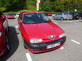 When it came to replacing the 33, Alfa decided that they needed not just a five door hatch, but a three door as well, just as had been offered with the AlfaSud. The three door model, the Alfa Romeo 145 (Tipo 930A) was first to appear, making its debut on static display at the April 1994 Turin Motor Show and then at the Paris Motor Show in July. A simultaneous European commercial launch was planned for 9 September, but it was delayed until October. It was only in April 1992 that work had begun on a second car, the 146 or Tipo 930B, derived from and to be sold alongside the 145; with its more traditionally Alfa Romeo style it was aimed at a different clientele, that of the outgoing Alfa Romeo 33. The 146 premiéred in November 1994 at the Bologna Motor Show and went on sale in May 1995. The two cars shared design plans and interior components from the B-pillar forwards, but with very different looking rear ends. Based, as they were, on the Fiat Group’s Tipo Due (Type Two) platform, the 145 and 146 had a unibody structure, front MacPherson strut and rear trailing arm suspensions. A peculiarity of these cars is that they were designed to be fitted with both longitudinal engines (the older Boxers) and with transverse engines (the diesels and the Twin Spark). The former were mounted in the same configuration as on the 33 or Alfasud, that is longitudinally overhanging the front axle with the gearbox towards the cabin; the latter in the conventional transverse position with the gearbox to the left side. All engines were coupled to 5-speed manual transmissions. Steering was rack and pinion, with standard hydraulic power assistance. At launch the engine line-up for both cars comprised a 1.9-litre inline-four turbo diesel and the boxer petrol engines from the 33, in 1.3 8-valve, 1.6 8-valve and range topping 1.7 16-valve flat four forms. Depending on the market, the engines were available in either or both base and better equipped L (for “Lusso”) trim levels; L trim standard equipment was richer on larger engined cars. Flagship sport models with the two-litre 16-valve Twin Spark inline-four engine from the Alfa Romeo 155 arrived a year after the début: the 145 Quadrifoglio and 146 ti. Each of the two-litre versions had a unique trim level; both included richer standard equipment than L trims, like ABS, leather-wrapped steering wheel and shifter knob and available Recaro sport seats. The 145 Quadrifoglio (145 Cloverleaf in the UK), launched at the September 1995 Frankfurt Motor Show and on sale from October,had deep body-colour side skirts with “green cloverleaf” badges and 5-hole alloy wheels. The 146 ti went on sale in February 1996. It came with painted side skirts, a boot spoiler and 12-hole alloy wheels. Two-litre cars were equipped with stiffer suspension, uprated all-disk braking system, ABS, wider, lower-profile tires and ‘quick-rack’ direct steering (also seen on the 155, GTV and Spider) which improved responsiveness, but also compromised the turning circle. The sporty suspension set-up was harsher than many others in its category at the time, but this was in line with the Fiat Group’s marketing of Alfa Romeo as a sporting brand and it is said to have resulted in class leading handling. From January 1997 all the boxer engines were phased out in favour of 1.4, 1.6 and 1.8 versions of the Twin Spark 16-valve engine.1.8-litre cars adopted the sport chassis, steering and brakes of the Quadrifoglio/ti, and also offered some of their optional equipment such as the sport seats. At the same time the interior was updated: a new air conditioning system, a redesigned dashboard an upholstered insert were fitted. Outside changes were minor: new wheel covers and alloy wheels and a wider choice of paint colours. In late 1997 Alfa Romeo introduced the Junior, a trim level targeted at young buyers that combined the sport styling and chassis setup of the range topping models with the affordable entry-level 1.4 powertrain,later with 1.6 engine too. Based on the 1.4 L, Junior cars were distinguished by the Quadrifoglio’s side skirts with “Junior” badges, specific 15 inch alloy wheels, and by the stainless steel exhaust tip (as well as, on the 146, the boot spoiler) from the ti. A year later 1.8 and 2.0 Twin Spark engines received the updates first introduced on the Alfa Romeo 156; thanks to variable length intake manifolds the two powertrains gained 4-5 PS and reached peak torque at engine speeds some 500 rpm lower. At the Geneva Motor Show in March 1999 Alfa Romeo introduced the restyled ’99 line-up for both models. The new common rail direct injection 1.9 JTD turbo diesel replaced the 1.9 TD. The main changes outside were new, body-colour bumpers with round fog lights and narrow protection strips; the interior got new upholstery and detail trim changes such as chrome vent surrounds. Optional side airbags complemented the already available passenger and standard driver airbags. The Junior trim level was discontinued, in favour of “pack sport” option package that included side skirts, rear spoiler, alloy wheels, leather-wrapped steering wheel and sport seats, all standard features on the two-litre models. A second “pack lusso” package offered leather steering wheel, velour upholstery and mahogany wood trim. In September of the next year, at the Paris Motor Show the all-new Alfa Romeo 147 was presented Eventually, in 2000, the 145/146 cars were superseded by the all-new 147, which was a far bigger commercial success, with its acclaimed styling front end and improved quality. Still, many enthusiasts feel that it lost a little of the special feel and Alfa Romeo that the 145 had. 221,037 145s and 233,295 146s were built, There are depressingly few survivors of either model in the UK, so it was nice to see both the 145 and 146 represented here.