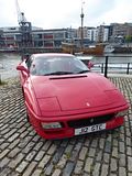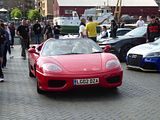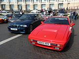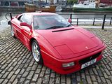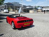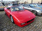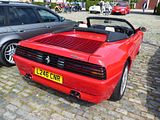With styling that had a close link to the Testarossa, the next V8 Ferrari to be launched, in 1989, was the 348, as a replacement for the 328 GTB/GTS models, and there were several examples of this model here. At launch, the 348 series were not that enthusiastically received by the press who found much to complain about. The 348’s styling differed from previous models with straked side air intakes and rectangular taillights resembling the Testarossa. Launched in two models, a coupe badged 348 tb (Trasversale Berlinetta) and targa roofed 348 ts (Targa), these were soon joined by a fully open car, the 348 Spider. All featured a normally aspirated 3.4-litre version of the quad-cam, four-valve-per-cylinder V8 engine. As with its predecessors, the model number was derived from this configuration, with the first two digits being the displacement and the third being the number of cylinders. The engine, which produced 300 hp was mounted longitudinally and coupled to a transverse manual gearbox, like the Mondial t with which the 348 shared many components. This was a significant change for Ferrari, with most previous small Ferraris using a transverse engine with longitudinal transmission. The “T” in the model name 348 tb and ts refers to the transverse position of the gearbox. The 348 was fitted with dual-computer engine management using twin Bosch Motronic ECUs, double-redundant anti-lock brakes, and self-diagnosing air conditioning and heating systems. Late versions (1993 and beyond) have Japanese-made starter motors and Nippondenso power generators to improve reliability, as well as the battery located within the front left fender for better weight distribution. Similar to the Testarossa but departing from the BB 512 and 308/328, the oil and coolant radiators were relocated from the nose to the sides, widening the waist of the car substantially, but making the cabin much easier to cool since hoses routing warm water no longer ran underneath the cabin as in the older front-radiator cars. This also had the side effect of making the doors very wide. The 348 was equipped with a dry-sump oil system to prevent oil starvation at high speeds and during hard cornering. The oil level can only be accurately checked on the dipstick when the motor is running due to this setup. The 348 was fitted with adjustable ride-height suspension and a removable rear sub-frame to speed up the removal of the engine for maintenance. Despite trenchant criticism of the car, especially its handling, 2,895 examples of the 348 tb and 4,230 of the 348 ts were produced. Seen here was a 348 Spider model.