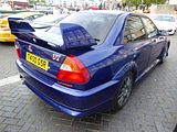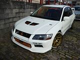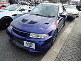 In 2001, Mitsubishi was forced by the FIA to run in the WRC using WRC rules for building a car instead of the Group A class rules, and thus did not need to follow homologation rules. The Evolution VII was based on the larger Lancer Cedia platform and as a result gained more weight over the Evolution VI, but Mitsubishi made up for this with multiple important chassis tweaks. The biggest change was the addition of an active centre differential and a more effective limited-slip differential, while a front helical limited-slip differential was added. Torque was increased again to 385 N⋅m (284 lb⋅ft) with engine tweaks that allowed greater airflow, and horsepower officially remained at 280 PS (276 bhp). The introduction of the Evolution VII also marked the first time an automatic drivetrain was included within the model lineup—the GT-A. Noted as the ‘grand theft auto’ version of the visually similar VII GSR and the RS2, the GT-A model was only produced in 2002 and had the following distinguishing interior and exterior specification: GT-A-only diamond cut finish 17-inch (431.8 mm) alloy wheels, clear rear light lenses and all-in-one style front headlights (later used on the Evolution VIII). The GT-A had the option of either no spoiler, the short spoiler (as per the Lancer Cedia; and later used on the Evolution VIII 260) or the thunderspoiler as used on the standard Evolution VII models. The most distinguishing feature was a smooth bonnet with no air-grills on it at all and the revised front bumper. Although offering inferior cooling capabilities, the bonnet was designed to give a cleaner line through the air with less air resistance at motorway speeds. Interior could be specified with factory options of a deluxe velour interior, full leather or the Recaro sports seats. The GT-A interior was different in that it had chromed door handles, a different instrument panel (to show the gear selection) and chrome edged bezels around the speedo and tach. The GT-A also had additional sound deadening installed from the factory and the engine manifold and downpipe had been engineered to be quieter. The 5-speed automatic gearbox had what Mitsubishi called “fuzzy logic”, which meant that the car would learn what the driver’s driving characteristics were like and would adapt the gear change timings and kick down reactions accordingly. The gears could be manually selected as with most Tiptronics via steering wheel + and – buttons (a pair both sides) or via selecting the tiptronic gate with the gear lever. Power was down a little from the standard manual cars with 272 PS 268 bhp). The GT-A gearbox did not appear again in the Evolution VIII but has been installed in the estate version of the Evolution IX Wagon. It was replaced by the Twin Clutch SST gearbox since the introduction of Evolution X. The Mitsubishi Lancer Evolution VIII was modified again in 2003 this time sporting 17″ grey Enkei wheels, Brembo brakes and Bilstein shocks to handle traction and a 5-speed manual gearbox with 280 PS (276 hp). Originally a one off model, sales were so successful in the U.S. that by 2005 it was available in four trims: the standard GSR model in Japan, the RS, 5-speed gearbox, and standard wheels (lacking excess components, such as interior map lights, power windows/doors, and radio), the SSL (with a sunroof, trunk mounted subwoofer, and leather seats) All of which had chrome head and taillight housings, and the MR, which came with a revised front limited-slip differential, aluminium MR shift knob, handbrake with carbon fibre handle, 17 inch BBS wheels, aluminium roof, and a 6-speed manual gearbox. The new Evolution Mr also sported Black housing taillights and headlights. The Mitsubishi Lancer Evolution VIII MR uses slick-response Bilstein shocks for improved handling. The aluminium roof panel and other reductions in body weight have lowered the centre of gravity to produce more natural roll characteristics. Detail improvements have also been made to Mitsubishi’s own electronic four-wheel drive, to the ACD 5 + Super AYC 6 traction control, and to the Sports ABS systems. The Lancer Evolution VIII displayed at the 2003 Tokyo Motor Show took the MR designation traditionally reserved for Mitsubishi Motors high-performance models (first used for the Galant GTO). Other parts on the MR include BBS alloy wheels, the aforementioned Bilstein shocks, and an aluminium roof. In the United Kingdom, many special Evolutions were introduced, including the FQ300, FQ320, FQ340, and FQ400 variants. They came with 305, 325, 345, and 405 bhp, respectively. The FQ-400, sold through Ralliart UK, produced 411 PS (405 bhp) at 6,400 rpm and maximum torque of 481 Nm (355 lb/ft) at 5,500 rpm, from its 1,997 cc 4G63 inline-four engine, the result of special modifications by United Kingdom tuning firms Rampage Tuning, Owen Developments, and Flow Race Engines. At 202.8 hp per litre, it has one of the highest specific outputs per litre of any road car engine.[citation needed] With a curb weight of 1,450 kg (3,197 lb), it achieves 0–60 mph (97 km/h) in 3.5 seconds, 0–100 mph in 9.1 seconds, 1⁄4 mile in 12.1 seconds at 117 mph (188 km/h), and a top speed of 175 mph (282 km/h) while costing £48,000. BBC’s television series Top Gear demonstrated that the stock FQ-400 could keep up with a Lamborghini Murciélago around a test track. The Stig recorded a Top Gear Power Lap Time of 1 minute and 24.8 seconds (damp track), 1.1 seconds slower than the Murciélago’s time of 1 minute 23.7 seconds (dry track). In a similar test conducted by Evo magazine, the Evolution was able to lap the Bedford Autodrome faster than an Audi RS4 and a Porsche 911 Carrera 4S. Mitsubishi introduced the Lancer Evolution IX in Japan on March 3, 2005, and exhibited the car at the Geneva Motor Show for the European market the same day. The North American markets saw the model exhibited at the New York International Auto Show the following month. The 1,997 cc 