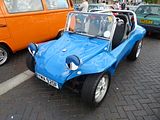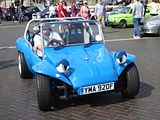 The Meyers Manx dune buggy is a small recreationally-oriented automobile, designed initially for desert racing by Californian engineer, artist, boat builder and surfer Bruce F. Meyers. It was produced by his Fountain Valley, California company, B. F. Meyers & Co. from 1964 to 1971, in the form of car kits applied to shortened chassis of Volkswagen Beetles. The car line dominated dune racing in its time, breaking records immediately, and was eventually also released in street-oriented models, until the company’s demise due to tax problems after Meyers’s departure. New vehicles inspired by the original Manx buggy have been produced by Meyers’s re-founded operation, Meyers Manx, Inc., since 2000. The name and cat logo of the brand derives from the Manx cat, by virtue of the tailless breed’s and the shortened vehicle’s truncated “stubbiness”. Drawing on his experience in sailboat construction, Meyers modeled and built his first dune buggy, “Old Red”, a shortened VW Beetle with a monocoque, fiberglass shell and Chevrolet pickup truck (trailing arm style) suspension, in late 1963 to May 1964 in his garage in Newport Beach, California. The first known street-legal fiberglass dune buggy, it featured a unibody shell that fused body, fenders and frame, retaining just the engine, transmission and other mechanicals of the VW, and with no top and no hood. The use of compound curves throughout provided great rigidity. The fenders were arched high, to make room for large, knobby dirt-racing wheels. The “Manx” name for the shortened, taller-wheeled, more maneuverable VW Beetle mods refers to and derives from the comparably stubby Manx cat breed, colloquially called “stubbins”; they are short-spined and stub-tailed-to-tailless, long-legged, and known for their turning ability while chasing. The Meyers Manx logo prominently features a Manx cat. The tailless cat in the logo, as featured on the hood ornament, is stylized after a passant heraldic lion, its right forepaw brandishing a sword. The name also suggests racing fitness, as the already globally renowned, British-manufactured Norton Manx motorcycle dominated the Isle of Man TT, Manx Grand Prix and other Isle of Man-based (i.e. Manx) international races from the 1940s to the early 1970s. The Meyers Manx has no direct connection to the Isle of Man. Meyers produced kits later in 1964 and into 1965, marketed under the name Meyers Manx. Although this early design was critically acclaimed, even featured on the April 1967 cover of Car & Driver magazine, and drew much attention, it proved too expensive to be profitable; ultimately only 12 kits of the monocoque Manx were produced. Meyers and a friend (both amateur racers) broke by over four hours the Ensenada – La Paz run’s record of 39 hours, until then held by a pro racer. According to James Hale, compiler of the Dune Buggy Handbook, this feat ushered in an era of Meyers Manx “domination in off-road events … and the formation of NORRA (National Off-Road Racing Association)”. The commercially manufactured Meyers Manx Mk I featured an open-wheeled fiberglass bodyshell, coupled with the Volkswagen Beetle H4 flat-four engine (1.2 L, 1.3 L, 1.5 L and 1.6 L, in different models) and a modified, RR-layout Beetle frame. It is a small car, with a wheelbase 14¼ inches (36.2 cm) shorter than a Beetle automobile for lightness and better maneuverability. For this reason, the car is capable of very quick acceleration and good off-road performance, despite not being four-wheel drive. The usually street-legal car redefined and filled a recreational and competitive niche that had been essentially invented by the first civilian Jeep in 1945, and which was later to be overtaken by straddle-ridden, motorcycle-based all-terrain vehicles (introduced in 1970) and newer, small and sporty (but usually four-wheel-drive), off-road automobiles. The commercial Meyers Manx received widespread recognition when it defeated motorcycles, trucks and other cars to win the inaugural 1967 Mexican 1000 race (the predecessor of the Baja 1000). It crossed automotive press genre lines, being selected as the cover story in the August 1966 issue of Hot Rod magazine. Approximately 6,000 of the original Meyers Manx dune buggies were produced, but when the design became popular many copies (estimated at a quarter of a million worldwide) were made by other companies. Although already patented, Meyers & Co. lost in court to the copiers, the judge rescinding his patent as unpatentable, opening the floodgates to the industry Meyers started. Since then, numerous vehicles of the general “dune buggy” or “beach buggy” body type, some VW-based, others not, have been and continue to be produced. An early example was the Imp by EMPI (1968–1970), which borrowed stylistic elements from the Chevrolet Corvette but was otherwise Manx-like. A later 1970s Manx clone was the Dune Runner from Dune Buggy Enterprises in Westminster, California. The Meyers company attempted to stay ahead of this seemingly unfair competition with the release of the distinctive, and harder-to-copy, Meyers Manx Mk II design. B. F. Meyers & Co. also produced other Beetle-based vehicles, including the May 1970 Car & Driver magazine cover sporty Manx SR variant (street roadsters, borrowing some design ideas from the Porsche 914), the Meyers Tow’d (sometimes referred to as the “Manx Tow’d”, a non-street-legal racing vehicle designed to be towed to the desert or beach), the Meyers Tow’dster (a street-legal hybrid of the two, and Meyers Resorter a.k.a. Meyers Turista (a small recreational or “resort” vehicle inspired by touring motorcycles). The Manx SR2 was a modified SR that was only produced by later manufacturers including Karma Coachworks, Heartland Motors and Manx Motors of MD. While the Tow’d was a minimal off-road racer and the SR/SR2 was a showy roadster, the Tow’dster was a compromise between a dune-capable vehicle and a more ut