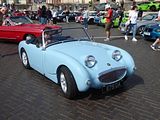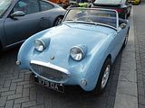 Known officially as the Sprite, it was announced to the press in Monte Carlo by the British Motor Corporation on 20 May 1958, just before that year’s Monaco Grand Prix. It was intended to be a low-cost model that “a chap could keep in his bike shed”, yet be the successor to the sporting versions of the pre-war Austin Seven. The Sprite was designed by the Donald Healey Motor Company, with production being undertaken at the MG factory at Abingdon. It first went on sale at a price of £669, using a tuned version of the Austin A-Series engine and as many other components from existing cars as possible to keep costs down. It was produced for a little over 3 years before being replaced by a Mark 2 version, which was then joined by a badge-engineered MG version, the Midget, reviving a model name used by MG from the late 1920s through to the mid 1950s. Enthusiasts often refer to Sprites and the later Midgets collectively as “Spridgets.” The first Sprite quickly became affectionately known as the “frogeye” in the UK and the “bugeye” in the US, because its headlights were prominently mounted on top of the bonnet, inboard of the front wings. The car’s designers had intended that the headlights could be retracted, with the lenses facing skyward when not in use; a similar arrangement was used many years later on the Porsche 928. But cost cutting by BMC led to the flip-up mechanism being deleted, therefore the headlights were simply fixed in a permanently upright position, giving the car its most distinctive feature. The body was styled by Gerry Coker, with subsequent alterations by Les Ireland following Coker’s emigration to the US in 1957. The car’s distinctive frontal styling bore a strong resemblance to the defunct American 1951 Crosley Super Sport. The problem of providing a rigid structure to an open-topped sports car was resolved by Barry Bilbie, Healey’s chassis designer, who adapted the idea provided by the Jaguar D-type, with rear suspension forces routed through the bodyshell’s floor pan. The Sprite’s chassis design was the world’s first volume-production sports car to use unitary construction, where the sheet metal body panels (apart from the bonnet) take many of the structural stresses. The original metal gauge (thickness of steel) of the rear structure specified by Bilbie was reduced by the Austin Design Office during prototype build, however during testing at MIRA (Motor Industry Research Association) distortion and deformation of the rear structure occurred and the original specification was reinstated. The two front chassis legs projecting forward from the passenger compartment mean the shell is not a full monocoque. The front sheet-metal assembly, including the bonnet (hood) and wings, was a one-piece unit, hinged from the back, that swung up to allow access to the engine compartment. The 43 bhp, 948 cc OHV engine (coded 9CC) was derived from the Austin A35 and Morris Minor 1000 models, also BMC products, but upgraded with twin 11⁄8 inch SU carburettors which gave it 43 hp at 5200 rpm and 52 lb/ft at 3300 rpm. When tested by “The Motor” magazine in 1958. It had a top speed of 82.9 mph and could accelerate from 0-60 mph in 20.5 seconds. Fuel consumption of 43 mpg was recorded. The rack and pinion steering was derived from the Morris Minor 1000 and the front suspension from the Austin A35. The front suspension was a coil spring and wishbone arrangement, with the arm of the Armstrong lever shock absorber serving as the top suspension link. The rear axle was both located and sprung by quarter-elliptic leaf springs, again with lever-arm shock absorbers and top links. There were no exterior door handles; the driver and passenger were required to reach inside to open the door. There was also no boot lid, owing to the need to retain as much structural integrity as possible, and access to the spare wheel and luggage compartment was achieved by tilting the seat-backs forward and reaching under the rear deck, a process likened to potholing by many owners, but which resulted in a large space available to store soft baggage. The BMC Competition Department entered Austin Healey Sprites in major international races and rallies, their first major success coming when John Sprinzel and Willy Cave won their class on the 1958 Alpine Rally. Private competitors also competed with much success in Sprites. Because of its affordability and practicality, the Austin Healey Sprite was developed into a formidable competition car, assuming many variants by John Sprinzel, Speedwell and WSM. The Sebring Sprite became the most iconic of the racing breed of Austin Healey Sprites. Many owners use their Austin Healey Sprites in competition today, sixty years after its introduction. 48,987 “frogeye” Sprites were made and the car remains popular to this day.
