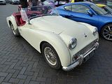 Launched in 1955, the TR3 was an evolution of the TR2 and not a brand new model. It was powered by a 1991 cc straight-4 OHV engine initially producing 95 bhp, an increase of 5 hp over the TR2 thanks to the larger SU-H6 carburettors fitted. This was later increased to 100 bhp at 5000 rpm by the addition of a “high port” cylinder head and enlarged manifold. The four-speed manual gearbox could be supplemented by an overdrive unit on the top three ratios, electrically operated and controlled by a switch on the dashboard. In 1956 the front brakes were changed from drums to discs, the TR3 thus becoming the first British series production car to be so fitted. The TR3 was updated in 1957, with various changes of which the full width radiator grille is the easiest recognition point and the facelifted model is commonly referred to as the Triumph “TR3A”, though unlike the later TR4 series, where the “A” suffix was adopted, the cars were not badged as such and the “TR3A” name was not used officially, Other updates included exterior door handles, a lockable boot handle and the car came with a full tool kit as standard (this was an option on the TR3). The total production run of the “TR3A” was 58,236. This makes it the third best-selling TR after the TR6 and TR7. The TR3A was so successful that the original panel moulds eventually wore out and had to be replaced. In 1959 a slightly modified version came out that had raised stampings under the bonnet and boot hinges and under the door handles, as well as a redesigned rear floor section. In addition, the windscreen was attached with bolts rather than the Dzus connectors used on the early “A” models. Partly because it was produced for less time, the original TR3 sold 13,377 examples, of which 1286 were sold within the UK; the rest being exported mainly to the USA.