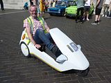 The Sinclair C5 is a one-person battery electric recumbent tricycle. It was the culmination of Sir Clive Sinclair’s long-running interest in electric vehicles. Although widely described as an “electric car”, Sinclair characterised it as a “vehicle, not a car”. Sinclair had become one of the UK’s best-known millionaires, and earned a knighthood, on the back of the highly successful Sinclair Research range of home computers in the early 1980s. He hoped to repeat his success in the electric vehicle market, which he saw as ripe for a new approach. The C5 emerged from an earlier project to produce a small electric car called the C1. After a change in the law, prompted by lobbying from bicycle manufacturers, Sinclair developed the C5 as an electrically powered tricycle with a polypropylene body and a chassis designed by Lotus Cars. It was intended to be the first in a series of increasingly ambitious electric vehicles, but the development of the follow-up C10 and C15 models never progressed further than the drawing board. On 10 January 1985, the C5 was unveiled at a glitzy launch event, but it received a less than enthusiastic reception from the British media. Its sales prospects were blighted by poor reviews and safety concerns expressed by consumer and motoring organisations. The vehicle’s limitations – a short range, a maximum speed of only 15 miles per hour (24 km/h) and a lack of weatherproofing – made it impractical for most people’s needs. It was marketed as an alternative to cars and bicycles, but ended up appealing to neither group of owners, and it was not available in shops until several months after its launch. Within three months of the launch, production had been slashed by 90%. Sales never picked up despite Sinclair’s optimistic forecasts and production ceased entirely by August 1985. Out of 14,000 C5s made, only 5,000 were sold before its manufacturer, Sinclair Vehicles, went into receivership. The C5 has been described as “one of the great marketing bombs of postwar British industry” and a “notorious … example of failure”. Despite its commercial failure, the C5 went on to become a cult item for collectors. Thousands of unsold C5s were purchased by investors and sold for hugely inflated prices, as much as £6,000 compared to the original retail value of £399. Enthusiasts have established owners’ clubs and some have modified their vehicles substantially, adding bigger wheels, jet engines, and high-powered electric motors to propel their C5s at speeds of up to 150 miles per hour (240 km/h). Seen here during the morning was event organiser, Dan Grazier, having some fun “driving” this example around the site.
