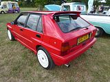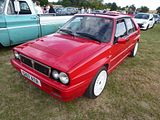 The Integrale evolved over several years, starting off as the HF Turbo 4WD that was launched in April 1986, to homologate a new rally car for Lancia who needed something to fill the void left by the cancellation of Group B from the end of 1986. The Delta HF 4X4 had a four-wheel drive system with an in-built torque-splitting action. Three differentials were used. Drive to the front wheels was linked through a free-floating differential; drive to the rear wheels was transmitted via a 56/44 front/rear torque-splitting Ferguson viscous-coupling-controlled epicyclic central differential. At the rear wheels was a Torsen (torque sensing) rear differential. It divided the torque between the wheels according to the available grip, with a maximum lockup of 70%. The basic suspension layout of the Delta 4WD remained the same as in the rest of the two-wheel drive Delta range: MacPherson strut–type independent suspension with dual-rate dampers and helicoidal springs, with the struts and springs set slightly off-centre. The suspension mounting provided more isolation by incorporating flexible rubber links. Progressive rebound bumpers were adopted, while the damper rates, front and rear toe-in and the relative angle between springs and dampers were all altered. The steering was power-assisted rack and pinion. The car looked little different from the front wheel drive models. In September 1987, Lancia showed a more sophisticated version of the car, the Lancia Delta HF Integrale 8V. This version incorporated some of the features of the Delta HF 4WD into a road car. The engine was an 8-valve 2 litre fuel injected 4-cylinder, with balancing shafts. The HF version featured new valves, valve seats and water pump, larger water and oil radiators, more powerful cooling fan and bigger air cleaner. A larger capacity Garrett T3 turbocharger with improved air flow and bigger inter-cooler, revised settings for the electronic injection/ignition control unit and a knock sensor, boosting power output to 185 bhp at 5300 rpm and maximum torque of 224 lb/ft at 3500 rpm. The HF Integrale had permanent 4-wheel drive, a front transversely mounted engine and five-speed gearbox. An epicyclic centre differential normally split the torque 56 per cent to the front axle, 44 per cent to the rear. A Ferguson viscous coupling balanced the torque split between front and rear axles depending on road conditions and tyre grip. The Torsen rear differential further divided the torque delivered to each rear wheel according to grip available. A shorter final drive ratio (3.111 instead of 2.944 on the HF 4WD) matched the larger 6.5×15 wheels to give 24 mph/1000 rpm in fifth gear. Braking and suspension were uprated to 284 mm ventilated front discs, a larger brake master cylinder and servo, as well as revised front springs, dampers, and front struts. Next update was to change the engine from 8 valves to 16. The 16v Integrale was introduced at the 1989 Geneva Motorshow, and made a winning debut on the 1989 San Remo Rally. It featured a raised centre of the bonnet to accommodate the new 16 valve engine, as well as wider wheels and tyres and new identity badges front and rear. The torque split was changed to 47% front and 53% rear. The turbocharged 2-litre Lancia 16v engine now produced 200 bhp at 5500 rpm, for a maximum speed of 137 mph and 0–100 km/h in 5.5 seconds. Changes included larger injectors, a more responsive Garrett T3 turbocharger, a more efficient intercooler, and the ability to run on unleaded fuel without modification. The first Evoluzione cars were built at the end of 1991 and through 1992. These were to be the final homologation cars for the Lancia Rally Team; the Catalytic Evoluzione II was never rallied by the factory. The Evoluzione I had a wider track front and rear than earlier Deltas. The bodyside arches were extended and became more rounded. The wings were now made in a single pressing. The front strut top mounts were also raised, which necessitated a front strut brace. The new Integrale retained the four wheel drive layout. The engine was modified to produce 210 bhp at 5750 rpm. External changes included: new grilles in the front bumper to improve the air intake for engine compartment cooling; a redesigned bonnet with new lateral air slats to further assist underbonnet ventilation; an adjustable roof spoiler above the tailgate; new five-bolt wheels with the same design of the rally cars; and a new single exhaust pipe. Interior trim was now grey Alcantara on the Recaro seats, as fitted to the earlier 16V cars; leather and air conditioning were offered as options, as well as a leather-covered Momo steering wheel. Presented in June 1993, the second Evolution version of the Delta HF Integrale featured an updated version of the 2-litre 16-valve turbo engine to produce more power, as well as a three-way catalyst and Lambda probe. A Marelli integrated engine control system with an 8 MHz clock frequency which incorporates: timed sequential multipoint injection; self-adapting injection times; automatic idling control; engine protection strategies depending on the temperature of intaken air; Mapped ignition with two double outlet coils; Three-way catalyst and pre-catalyst with lambda probe (oxygen sensor) on the turbine outlet link; anti-evaporation system with air line for canister flushing optimised for the turbo engine; new Garrett turbocharger: water-cooled with boost-drive management i.e. boost controlled by feedback from the central control unit on the basis of revs/throttle angle; Knock control by engine block sensor and new signal handling software for spark park advance, fuel quantity injected, and turbocharging. The engine now developed 215 PS as against 210 PS on the earlier uncatalysed version and marginally more torque. The 1993 Integrale received a cosmetic and functional facelift that included. new 16″ light alloy rims with 205/45 ZR 16 tyres; body colour roof moulding to underline the connection between the r
