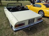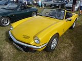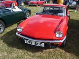 Based on the chassis and mechanicals of the Triumph Herald, the Spitfire was conceived as a rival to the Austin-Healey Sprite and MG Midget, which were launched a year earlier. The Triumph soon found a strong following, with many preferring it to the BMC cars which in time would become in-house stablemates. Mark II models arrived in 1965 and a more comprehensive facelift in 1967 with the distinctive “bone in mouth” front grille necessitated by US bumper height regulations also brought changes, but it was with the Mark IV that the greatest number of alterations would come about. The Mark IV featured a completely re-designed cut-off rear end, giving a strong family resemblance to the Triumph Stag and Triumph 2000 models, both of which were also Michelotti-designed. The front end was also cleaned up, with a new bonnet pressing losing the weld lines on top of the wings from the older models, and the doors were given recessed handles and squared-off glass in the top rear corner. The interior was much improved: a proper full-width dashboard was provided, putting the instruments ahead of the driver rather than over the centre console. This was initially black plastic however was replaced with wood in 1973. An all-new hardtop was also available, with rear quarter-lights and a flatter rear screen. By far the most significant change, however, was to the rear suspension, which was de-cambered and redesigned to eliminate the unfortunate tendencies of the original swing-axle design. The Triumph GT6 and Triumph Vitesse had already been modified, and the result on all these cars was safe and progressive handling even at the limit. The 75 hp engine was now rated at 63 hp (for UK market employing the 9:1 compression ratio and twin SU HS2 carburettors; the less powerful North American version still used a single Zenith Stromberg carburettor and an 8.5:1 compression ratio) due to the German DIN system; the actual output was the same for the early Mark IV. However, it was slightly slower than the previous Mark III due to carrying more weight, and employing a taller 3.89:1 final drive as opposed to the earlier 4.11:1. The engine continued at 1296 cc, but in 1973 was modified with larger big-end bearings to rationalise production with the TR6 2.5 litre engines, which somewhat decreased its “revvy” nature; there was some detuning, to meet new emissions laws, which resulted in the new car being a little tamer. With the overall weight also increasing to 1,717 lb (779 kg) the performance dropped as a consequence, 0 to 60 mph now being achieved in 15.8 seconds and the top speed reducing to 90 mph. The overall fuel economy also dipped to 32mpg. The gearbox gained synchromesh on its bottom gear. The Mark IV went on sale in the UK at the end of 1970 with a base price of £735. In 1973 in the United States and Canada, and 1975 in the rest of the world, the 1500 engine was used to make the Spitfire 1500. Although in this final incarnation the engine was rather rougher and more prone to failure than the earlier units, torque was greatly increased by increasing the cylinder stroke to 87.5 mm (3.44 in), which made it much more drivable in traffic. While the rest of the world saw 1500s with the compression ratio reduced to 8.0:1, the American market model was fitted with a single Zenith-Stromberg carburettor and a compression ratio reduced to 7.5:1 to allow it to run on lower octane unleaded fuel, and after adding a catalytic converter and exhaust gas recirculating system, the engine only delivered 53 bhp with a slower 0–60 time of 16.3 seconds. The notable exception to this was the 1976 model year, where the compression ratio was raised to 9.1:1. This improvement was short-lived, however, as the ratio was again reduced to 7.5:1 for the remaining years of production. In the UK the 9:1 compression ratio, less restrictive emissions control equipment, and the Type HS2 SU carburettors now being replaced with larger Type HS4 models, led to the most powerful variant to date. The 1500 Spitfire now produced 71hp (DIN) at 5500 rpm, and produced 82 lb/ft of torque at 3000 rpm. Top speed was now at the magical 100 mph mark, and 0 to 60 mph was reached in 13.2 seconds. Fuel economy was reduced to 29mpg. Further improvements to the suspension followed with the 1500 included longer swing axles and a lowered spring mounting point for more negative camber and a wider rear track. The wider, lower stance gave an impressive skid pad result of 0.87g average. This put the Spitfire head and shoulders over its competition in handling. The American market Spitfire 1500 is easily identified by the big plastic over-riders and wing mounted reflectors on the front and back wings. The US specification models up to 1978 still had chrome bumpers, but on the 1979 and 1980 models these were replaced by black rubber bumpers with built-in over-riders. Chassis extensions were also fitted under the boot to support the bumpers. Detail improvements continued to be made throughout the life of the Mark IV, and included reclining seats with “chequered brushed nylon centre panels” and head restraints, introduced for domestic market cars early in 1977 along with a new set of column stalk operated minor controls (as fitted already in the TR7) replacing the old dashboard mounted knobs and switches. Also added for the model’s final years were a wood dash, hazard flashers and an electric screen washer, in place of the previous manual pump operated ones. Options such as the hard top, tonneau cover, map light and overdrive continued to be popular, but wire wheels ceased to be available. The 1980 model was the last and the heaviest of the entire run, weighing 1,875 lb (850.5 kg). Base prices for the 1980 model year was £3,631 in the UK. The last Spitfire, an Inca Yellow UK-market model with hardtop and overdrive, rolled off the assembly line at Canley in August 1980, shortly before the factory closed. It was never sold and is now displayed at the museum at