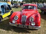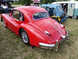 The XK140, was the successor to the XK120, with a number of useful changes and upgrades over the earlier car which included more interior space, improved brakes, rack and pinion steering, increased suspension travel, and telescopic shock absorbers instead of the older lever arm design. The XK140 was introduced in late 1954 and sold as a 1955 model. Exterior changes that distinguished it from the XK120 included more substantial front and rear bumpers with overriders, and flashing turn signals (operated by a switch on the dash) above the front bumper. The grille remained the same size but became a one-piece cast unit with fewer, and broader, vertical bar, making it easy to tell an XK140 apart from an XK120. The Jaguar badge was incorporated into the grille surround. A chrome trim strip ran along the centre of the bonnet and boot lid. An emblem on the boot lid contained the words “Winner Le Mans 1951–3”. The interior was made more comfortable for taller drivers by moving the engine, firewall and dash forward to give 3 inches more legroom. Two 6-volt batteries, one in each front wing were fitted to the Fixed Head Coupe, but Drop Heads and the Open Two Seater had a single 12-volt battery. This was installed in the front wing on the passenger side (e.g. In the left wing on right hand drive cars and in the right wing on left hand drive). The XK140 was powered by the Jaguar XK engine with the Special Equipment modifications from the XK120, which raised the specified power by 10 bhp to 190 bhp gross at 5500 rpm, as standard. The C-Type cylinder head, carried over from the XK120 catalogue, and producing 210 bhp ross at 5750 rpm, was optional equipment. When fitted with the C-type head, 2-inch sand-cast H8 carburettors, heavier torsion bars and twin exhaust pipes, the car was designated XK140 SE in the UK and XK140 MC in North America. In 1956 the XK140 became the first Jaguar sports car to be offered with automatic transmission. As with the XK120, wire wheels and dual exhausts were options, and most XK140s imported into the United States had wire wheels. Cars with the standard disc wheels had spats (fender skirts) over the rear wheel opening. When leaving the factory it originally fitted either 6.00 × 16 inch crossply tyres or you could specify 185VR16 Pirelli Cinturato CA67 as a radial option on either 16 × 5K½ solid wheels or 16 × 5K (special equipment) wire wheels. The Roadster (designated OTS – Open Two Seater – in America) had a light canvas top that folded out of sight behind the seats. The interior was trimmed in leather and leatherette, including the dash. Like the XK120 Roadster, the XK140 version had removable canvas and plastic side curtains on light alloy barchetta-type doors, and a tonneau cover. The door tops and scuttle panel were cut back by two inches compared to the XK120, to allow a more modern positioning of the steering wheel. The angle of the front face of the doors (A-Post) was changed from 45 degrees to 90 degrees, to make access easier. The Drophead Coupé (DHC) had a bulkier lined canvas top that lowered onto the body behind the seats, a fixed windscreen integral with the body (the Roadster’s screen was removable), wind-up side windows, and a small rear seat. It also had a walnut-veneered dashboard and door cappings. The Fixed Head Coupé (FHC) shared the DHC’s interior trim and rear seat. The prototype Fixed Head Coupe retained the XK120 Fixed Head roof-profile, with the front wings and doors the same as the Drophead. In production, the roof was lengthened with the screen being placed further forward, shorter front wings, and longer doors. This resulted in more interior space, and more legroom. The XK140 was replaced by the XK150 in March 1957