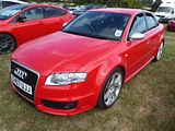 Still highly rated more than a decade after production ceased is the B7 generation RS4, seen here in regular Saloon guise. There was no RS4 built on the Audi “B6” platform that served as the basis for the Audi A4 between 2001 and 2005. However, after a long hiatus, the second Audi RS4 quattro (Typ 8E), was built on Audi’s “B7” A4 platform. It was unveiled in February 2005. The RS4 became available to European customers in mid-2006. It was introduced at the 2006 North American International Auto Show in January, and arrived in June 2006 in North America. The B7 RS4 was an almost complete departure from previous Audi “RS” cars, as it was initially available as a four-door five-seat saloon with a five-door five-seat Avant and two-door four-seat Cabriolet versions arriving later. Only the Audi RS6 had taken this similar route (saloon and Avant) before; the previous RS4 and RS2 were available exclusively as Avants. Constructed from fully galvanised steel, the B7 RS4 uses lightweight aluminium for its front wings and bonnet. The saloon version features a drag coefficient (Cd) of 0.31, from a frontal area of 2.17 m2. Like its B5 predecessor, visually, the B7 RS4 differs from its related B7 S4, by having even wider flared front and rear wheel arches, to allow for a wider axle track. Over the B7 A4, it also includes two larger frontal side air intakes (for the two additional side-mounted coolant radiators). The trim on the saloon and roof rails on the estate are chrome as standard but can also be found in black with the addition of the Optic Pack which includes a black front grill, all exterior trim and black roof rails on the estate version. The B7 RS4 also includes an optional adaptive headlights to complement the standard “Xenon Plus” (Bi-Xenon) High Intensity Discharge (HID) headlamps, which swivel around corners in conjunction with steering wheel movements. Also standard are daytime running lights (DRLs), found within the main headlamp housings, identical to its related B7 A4 and S4, and use a conventional tungsten filament bulb. An acoustic parking system with front and rear sensors is also a standard fitment. Unique carbon fibre interior trims, along with a lap timer within the central Driver Information System (DIS), aluminium pedal caps and footrest, and RS 4 logos complete the look. Kerb weight of the saloon variant starts at 1,650 kg (3,638 lb). The engine of the B7 RS4 is based on the existing all-alloy 4,163 cc V8 from the B6 S4, and shares many parts, and Fuel Stratified Injection, with the 4.2 FSI V8 engine in the Q7. The engine includes new cylinder block construction, and is a highly reworked, high-revving variant (redline at 8,000 rpm; rev limit of 8,250 rpm). The same engine base was used for the Audi R8 when Audi wanted to build their first supercar. However, the camshaft drive system was moved to the front of the block for the mid-engine R8. Audi factory numbers indicate that the B7 RS4 saloon can accelerate from 0 to 100 km/h (0 to 62 mph) in 4.8 seconds, and arrive at 0 to 200 km/h (0 to 124 mph) in 16.6 seconds. Top speed for all variants is “officially” electronically limited to 250 km/h (155.3 mph), though some owners reported that the speed limiter is rather “liberal”, conforming to the pattern of previous Audi “RS” cars, with genuine top speeds of 270 km/h (168 mph) being recorded. The production run of the B7 RS 4 was 2006 to 2008 inclusive. Approximately 10,000 B7 RS4s were built, of which around 2,000 went to the USA.