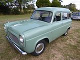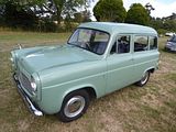 The Ford Escort and Squire were produced by Ford UK from 1955 to 1959, a two-door, four-seat estate design, related to the Ford Prefect 100E four-door saloon, sharing the same 1,172 cc Ford sidevalve 36 bhp engine and other parts and the same interior trim. It was substantially shorter than both the Prefect and the closely related Ford Anglia 100E two-door saloon. It used the short front doors of the four-door model because the bodyshell was optimized for use as a panel van (which was marketed as the Thames 300E). The rear door was in two pieces split horizontally. The rear seat could be folded flat to convert from a four-seater to a load carrier. Until 1957 there were wood trim pieces screwed to the sides of the vehicle. The Squire competed in the same market segment as the Hillman Husky and Austin A30 / A35 based estate, both significantly more popular in the UK than longer estates at the time. Total production was 17,812 cars. The Ford Escort was a mechanically identical estate car with the lower trim level of the Ford Anglia. This proved more popular, and a total of 33,131 Escorts were produced between 1955 and 1961. Production of the Escort continued until 1961, two years longer than the Squire.