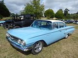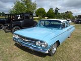 The Chevrolet Bel Air is a full-size car produced by Chevrolet for the 1950–1975 model years. Initially, only the two-door hardtops in the Chevrolet model range were designated with the Bel Air name from 1950 to 1952. With the 1953 model year, the Bel Air name was changed from a designation for a unique body shape to a premium level of trim applied across a number of body styles. The Bel Air continued with various other trim level designations, and it had gone from a mid-level trim car to a budget fleet sedan when U.S. production ceased in 1975. The Bel Air received a major redesign for the 1959 model year. The most visual new change was the flat, wing shaped tailfins. The car was built on a 119 in (3,000 mm) wheelbase and was 211 in (5,400 mm) long-which was 11 in (280 mm) longer than the 1957 model. This made Chevrolet the longest car in the low-priced range, whereas two years before it had been the shortest. In addition, the car was 3 in (76 mm) wider outside and had 5 in (130 mm) more width inside than it did in 1958, through the reduction of door thickness. The “X” frame from 1958 was continued, but enlarged and strengthened to support the new body. The Bel Air, which had been the top line series since 1953, was now the middle range. Wagons were still classed by themselves, but had model numbers matching the car series. Parkwood 6-passenger and Kingswood 9-passenger wagons had Bel Air’s model number, and as such were the middle range wagons. Under the hood, little change took place. A variety of speed options, such as fuel injection, special cams and lowered compression, gave horsepower ratings up to 315. Bel Air production was 447,100. The new Impala line surpassed Bel Air production by 20,000 units. A parking brake warning light was optional. Little change was made for 1960. The new models were refinements of the 1959 style with a much more restrained front end, the return of the double cone tail lights of 1958 rather than the startling “cat’s eyes” of 1959. Under the hood, things remained constant. Fuel injection was no longer available, but with the 348 cubic inch engine, a horsepower rating of 335 at 5800 rpm was now achieved. This involved the use of three double-barrel carburettors, a special cam and an 11.25:1 compression ratio, all sold as a package. Body style offerings followed 1959, with hardtops and sedans available. The convertible was reserved for the Impala series. The Bel Air Sport Sedan continued to use a rear window overhang and a huge wraparound rear window. Bel Airs (and Biscaynes) had two tail lights per side; the Impalas had three tail lights per side—a situation that would persist for most years through 1975. Many of the same options and accessories that were available on the Impala were also available on the Bel Air. The Bel Airs had more interior and exterior brightwork than the Biscayne.