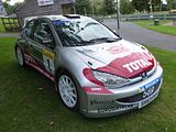 In 1999, Peugeot Sport unveiled the 206 WRC, and it competed for the first time in that year’s World Rally Championship, with French tarmac veteran and long-time marque stalwart Gilles Panizzi narrowly failing, against a resurgent reigning champion in Mitsubishi’s Tommi Mäkinen, to win the Rallye Sanremo. The car was soon a success, however, and won both the manufacturers’ and drivers’ championships in 2000, Peugeot’s first such accolades since their withdrawal from the WRC after Group B was banned after the 1986 season, and achieved in the hands of Panizzi, Francois Delecour and Mäkinen’s successor as drivers’ world champion, Marcus Grönholm. For 2001, Grönholm competed alongside two refugees of SEAT’s exit from the championship at the end of 2000; compatriot Harri Rovanperä and the French 1994 world champion, Didier Auriol. Rovanperä and Auriol each contributed single wins, on Swedish Rally and Rally Catalunya respectively (the former to be a sole career win for the Finn, and the latter victory helped by assorted problems for the blisteringly quick debuting Citroën Xsara WRCs), before Auriol left the team at the end of the season. Grönholm, meanwhile, suffered sufficient reliability woes in the first half of the year such that he could manage no higher than fourth overall in the series, although Peugeot did fend off Ford, with a 1–2 result by the two Finns on the season-ending Rally of Great Britain to successfully defend the constructors’ championship title. In 2002, Grönholm – despite now being paired in the factory line-up with defending 2001 champion from Subaru, the Briton Richard Burns – led Peugeot to a repeat of the WRC title double aboard his 206 WRC. His dominance that year was compared to Michael Schumacher’s dominance of Formula One. In summary, Peugeot won two drivers’ championships, in 2000 and 2002, and three manufacturers’ titles in a row between 2000 and 2002. However, by 2003 the 206 WRC was beginning to show its age and was less effective against the competition, notably the newer Xsara WRC and the Subaru Impreza WRC, so it was retired from competition at the end of the season, to be replaced with the 307 WRC, albeit, unlike its predecessor, based not on the production version’s hatchback, but its coupé cabriolet body style. The Peugeot 206 WRC was awarded the Autosport “Rally Car of the Year” in 2002, preceded by the Ford Focus RS WRC and followed by the Citroën Xsara WRC. In 2002, Peugeot GB created the Peugeot 206 Cup, a one-make rally championship aimed at young drivers. The championship was created to help young drivers develop their careers. The cars were built by Vic Lee Racing and drivers such as Tom Boardman, Luke Pinder and Garry Jennings all drove in the championship.A similar championship also existed in France. This is a road-registered car produced in tribute to the WRC cars.