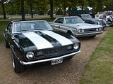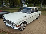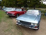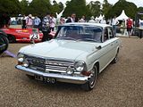 Attracting a lot of attention, even though it was far from the sort of exotic car that was to be surrounding it was this immaculate 1965 Cresta PB. he PB was a major styling revision, completely eliminating the tailfins, with a flat bonnet and generally more conservative styling taking its cues from the Victor FB introduced the previous year and with which it shared its doors. The engine was the same 2,651 cc straight six as the last of the PA series and although the compression ratio was increased to 8.5:1, power output remained at 95 bhp. Front disc brakes were now fitted as standard. In October 1963, an estate conversion was made available, the work carried out by Martin Walter Ltd. of Bedford Dormobile fame and fully approved by Vauxhall. The conversion featured a steel-framed glass fibre roof extension and tailgate. The rear doors with squared-off window frames were straight from the factory-built Victor estate. In October 1964 the engine was increased in capacity to 3293 cc by virtue of a larger, 92 mm, bore in combination with the original 82.55 mm stroke. Power increased to 115 bhp at 4,200 rpm. The model received a new full-width chrome grille incorporating the headlights and there was a full-length chrome strip along the body sides. The gearbox was still three-speed with column change but an overdrive was available. As standard, the 3.3-litre cars had a three-speed column-change gearbox, with a four-speed floor-change unit as an option. Three-speed hydramatic automatic transmission was available with both engines but this was changed to the two-speed Powerglide unit towards the end of the 3.3-litre PB run. Servo-assisted brakes, with discs at the front, were fitted. Minor changes to gearing and the option of power steering were introduced early in 1965 and, later in 1965, the white park/indicator front lamps were changed to amber lens indicators with the parking lamps now in the headlamps for the home market due to legislation changes. The PB series continued until replaced by the PC models in October of that year.