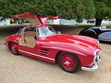 Known under development as the W198, the first iteration of the SL-Class grand tourer was the fastest production car of its day. Introduced in 1954 as a two-seat coupé with distinctive gull-wing doors, it was later offered as an open roadster. Built by Daimler-Benz AG, the direct fuel injected production model was based on the company’s highly successful yet somewhat less powerful carburettor overhead cam straight 6 1952 racer, the W194. The idea of a toned-down Grand Prix car tailored to affluent performance enthusiasts in the booming post-war American market was suggested by Max Hoffman. Mercedes accepted the gamble and the new 300 SL – 300 for its 3.0 litre engine displacement and SL for Sport Leicht (Sport Light) – was introduced at the 1954 New York Auto Show rather than the Frankfurt or Geneva gatherings company models made their usual debuts. Immediately successful and today iconic, the 300 SL stood alone with its distinctive doors, first-ever production fuel injection, and world’s fastest top speed. Even with the upward opening doors, the 300 SL had an unusually high sill, making entry and exit from the car’s cockpit problematic. A steering wheel with a tilt-away column was added to improve driver access. The 300 SL’s main body was steel, with aluminium bonnet, doors and boot lid. It could also be ordered with an 80 kg (180 lb) saving all-aluminium outer skin at tremendous added cost; just 29 were made. Like the W194, the 300 SL borrowed its 3.0 litre overhead cam straight-6 from the regular four-door 300 (W186 “Adenauer”) luxury tourer introduced in 1951. Featuring an innovative diagonal aluminium head that allowed for larger intake and exhaust valves, it was canted to the right at forty-five-degrees to fit under the SL’s considerably lower bonnet line. In place of the W194’s triple two-barrel Solex carburettors, a groundbreaking Bosch mechanical direct fuel injection was installed, boosting power almost 25% over the Grand Prix car’s. Derived from the DB 601 V12 used on the Messerschmitt Bf 109E fighter of World War II, it raised output from 175 hp to 215 hp, almost double that of the original Type 300 sedan’s 115 hp. An optional, even more powerful version, with radical camshaft developed 240 hp @ 6100 rpm and a maximum torque of 217 lb⋅ft @ 4800 rpm, but was rough for city use. The result was a top speed of up to 260 km/h (160 mph) depending on gear ratio and drag, making the 300 SL the fastest production car of its time. However, unlike today’s electrically powered fuel injection systems, the 300 SL’s mechanical fuel pump would continue to inject gasoline into the engine during the interval between shutting off the ignition and the engine’s coming to a stop; this unburned gasoline washed lubricating oil from the cylinder walls, which not only left them unprotected in affected areas during start-up but would dilute the engine’s entire oil supply if the car was not driven hard or long enough to reach a sufficient temperature to evaporate the fuel out of the oil. Exacerbating the problem was the engine’s large racing-oriented oil cooler and enormous 10 litre oil capacity, which virtually guaranteed the oil would not get hot enough. In practice, many owners would block off airflow through the oil cooler and stick rigidly to the appropriately low 1,000 mile recommended oil change interval. An auxiliary fuel pump provided additional fuel for extended high speed operation or cold starts; overuse would also lead to dilution of the oil., Clutch operation was initially very heavy, remedied by an improved clutch arm helper spring which reduced pedal force. From March 1963 to the end of production later that year, a light alloy crankcase was used on a total of 209 vehicles. Aerodynamics played an important role in the car’s speed, with Mercedes-Benz engineers placing horizontal “eyebrows” over the wheel openings to reduce drag. Unlike many cars of the 1950s, steering was relatively precise and the four-wheel independent suspension allowed for a reasonably comfortable ride and markedly better overall handling. However, the rear swing axle, jointed only at the differential, not at the wheels themselves, could be treacherous at high speeds or on imperfect roads due to extreme changes in camber. The enormous fuel tank capacity also caused a considerable difference in handling depending on the quantity of fuel on board. More than 80% of the vehicle’s total production of approximately 1400 units were sold in the US, making the Gullwing the first Mercedes-Benz widely successful outside its home market and thoroughly validating Hoffman’s prediction. The 300 SL is credited with changing the company’s image in America from a manufacturer of solid but staid luxury automobiles to one capable of rendering high-performance sports cars. It should be noted initial sales were sluggish due to many things, of which the price was one. Initial prices were about $6,400, a new Chevrolet Bel-Air could be purchased for $1,700 in the same year. Then there were few mechanics, even at the dealers, who understood the fuel injection system enough to do repairs. Nonetheless, 1400 were built by 1957, at which point Mercedes introduced a roadster version which was broadly similar, but with conventional doors. It was produced until 1963, and achieved sales of 1858 units.