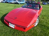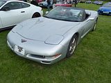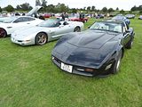 This is an example of the fourth generation Corvette to near the name. It was was the first complete redesign of the Corvette since 1963. Production was to begin for the 1983 model year but quality issues and part delays resulted in only 43 prototypes for the 1983 model year being produced that were never sold. All of the 1983 prototypes were destroyed or serialised to 1984 except one with a white exterior, medium blue interior, L83 350 ci, 205 bhp V8, and 4-speed automatic transmission. After extensive testing and modifications were completed, it was initially retired as a display sitting in an external wall over the Bowling Green Assembly Plant’s employee entrance. Later this only surviving 1983 prototype was removed, restored and is now on public display at the National Corvette Museum in Bowling Green, Kentucky. It is still owned by GM. On February 12, 2014, it was nearly lost to a sinkhole which opened up under the museum. Regular fourth generation production began on January 3, 1983; the 1984 model year and delivery to customers began in March 1983. The 1984 model carried over the 350 cu in (5.7 litre) L83 slightly more powerful (5 bhp) “Crossfire” V8 engine from the final 1982 third generation model. New chassis features were aluminium brake calipers and an all-aluminium suspension for weight savings and rigidity. The new one piece targa top had no centre reinforcement. A new electronic dashboard with digital liquid crystal displays for the speedometer and tachometer was standard. Beginning in 1985, the 230 bhp L98 engine with tuned port fuel injection became the standard engine. September 1984 through 1988 Corvettes offered a Doug Nash designed “4+3” transmission – a 4-speed manual coupled to an automatic overdrive on the top three gears. It was designed to help the Corvette meet U.S. fuel economy standards. Since 1981, when it was last offered, a manual transmission returned to the Corvette starting with production in late-1984. The transmission proved to be problematic and was replaced by a modern ZF 6-speed manual transmission in 1989. In 1986, the second Corvette Indy Pace Car was released. It was the first convertible Corvette since 1975. A Centre High Mounted Signal Light – a third centre brake light – was added in 1986 to comply with safety regulations. While the colour of the pace car used in the race was yellow, all 1986 convertibles also had an Indy 500 emblem mounted on the console, making any colour a “pace car edition”. In 1987, the B2K twin-turbo option became available from the factory. The Callaway Corvette was a Regular Production Option (RPO B2K). The B2K option coexisted from 1990 to 1991 with the ZR-1 option, which then replaced it. Early B2Ks produced 345 bhp and 450 lb·ft later versions boasted 450 bhp and 613 lb·ft .1988 saw the 35th Anniversary Edition of the Corvette. Each of these featured a special badge with an identification number mounted next to the gear selector, and were finished with a white exterior, wheels, and interior. In 1991, all Corvettes received updates to the body, interior, and wheels. The convex rear fascia that set the 1990 ZR-1 apart from the base model was now included on L98 Corvettes, making the styling of the expensive ZR-1 even closer to that of the base cars. The most obvious difference remaining between the base and ZR-1 models besides the wider rear wheels was the location of the CHMSL, which was integrated into the new rear fascia used on the base model, but remained at the top of the rear-hatch on the ZR-1’s. For the 1992 model year, the 300 bhp LT1 engine was introduced, an increase of 50 bhp over 1991’s L98 engine. This engine featured reverse-flow cooling (the heads were cooled before the block), which allowed for a higher compression ratio of 10.5:1. A new distributor was also debuted. Called “Optispark”, the distributor was driven directly off the front of the camshaft and mounted in front of the timing cover, just above the crankshaft and harmonic balancer. Also new for 1992 was Acceleration Slip Regulation (ASR), a form of traction control which utilised the Corvette’s brakes, spark retard, and throttle close-down to prevent excessive rear wheel spin and possible loss of control. The traction control device could be switched off if desired. A special 40th Anniversary Edition was released in 1993, which featured a commemorative Ruby Red colour, 40th anniversary badges, and embroidered seat backs. The 1993 Corvette also marked the introduction of the Passive Keyless Entry System, making it the first GM car to feature it. Production of the ZR-1 ended in 1995, after 6,939 cars had been built.[46] 1996 was the final year of C4 production, and featured special models and options, including the Grand Sport and Collector Edition, OBD II (On-Board Diagnostics), run flat tyres, and the LT4 engine. The 330 bhp LT4 V8 was available only with a manual transmission, while all 300 bhp LT1 Corvettes used automatic transmissions. Chevrolet released the Grand Sport (GS) version in 1996 to mark the end of production of the C4 Corvette. The Grand Sport moniker was a nod to the original Grand Sport model produced in 1963. A total of 1,000 GS Corvettes were produced, 810 as coupes and 190 as convertibles. The 1996 GS came with the high-performance LT4 V8 engine, producing 330 bhp and 340 lb·ft . The Grand Sport came only in Admiral Blue with a white stripe down the middle, and black wheels and two red stripes on the front left wheel arch Seen here was an early C4 coupe.