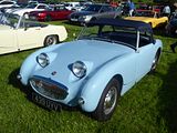Known officially as the Sprite, it was announced to the press in Monte Carlo by the British Motor Corporation on 20 May 1958, just before that year’s Monaco Grand Prix. It was intended to be a low-cost model that “a chap could keep in his bike shed”, yet be the successor to the sporting versions of the pre-war Austin Seven. The Sprite was designed by the Donald Healey Motor Company, with production being undertaken at the MG factory at Abingdon. It first went on sale at a price of £669, using a tuned version of the Austin A-Series engine and as many other components from existing cars as possible to keep costs down. It was produced for a little over 3 years before being replaced by a Mark 2 version, which was then joined by a badge-engineered MG version, the Midget, reviving a model name used by MG from the late 1920s through to the mid 1950s. Enthusiasts often refer to Sprites and the later Midgets collectively as “Spridgets.” The first Sprite quickly became affectionately known as the “frogeye” in the UK and the “bugeye” in the US, because its headlights were prominently mounted on top of the bonnet, inboard of the front wings. The car’s designers had intended that the headlights could be retracted, with the lenses facing skyward when not in use; a similar arrangement was used many years later on the Porsche 928. But cost cutting by BMC led to the flip-up mechanism being deleted, therefore the headlights were simply fixed in a permanently upright position, giving the car its most distinctive feature. The body was styled by Gerry Coker, with subsequent alterations by Les Ireland following Coker’s emigration to the US in 1957. The car’s distinctive frontal styling bore a strong resemblance to the defunct American 1951 Crosley Super Sport. The problem of providing a rigid structure to an open-topped sports car was resolved by Barry Bilbie, Healey’s chassis designer, who adapted the idea provided by the Jaguar D-type, with rear suspension forces routed through the bodyshell’s floor pan. The Sprite’s chassis design was the world’s first volume-production sports car to use unitary construction, where the sheet metal body panels (apart from the bonnet) take many of the structural stresses. The original metal gauge (thickness of steel) of the rear structure specified by Bilbie was reduced by the Austin Design Office during prototype build, however during testing at MIRA (Motor Industry Research Association) distortion and deformation of the rear structure occurred and the original specification was reinstated. The two front chassis legs projecting forward from the passenger compartment mean the shell is not a full monocoque. The front sheet-metal assembly, including the bonnet (hood) and wings, was a one-piece unit, hinged from the back, that swung up to allow access to the engine compartment. The 43 bhp, 948 cc OHV engine (coded 9CC) was derived from the Austin A35 and Morris Minor 1000 models, also BMC products, but upgraded with twin 11⁄8 inch SU carburettors which gave it 43 hp at 5200 rpm and 52 lb/ft at 3300 rpm. When tested by “The Motor” magazine in 1958. It had a top speed of 82.9 mph and could accelerate from 0-60 mph in 20.5 seconds. Fuel consumption of 43 mpg was recorded. The rack and pinion steering was derived from the Morris Minor 1000 and the front suspension from the Austin A35. The front suspension was a coil spring and wishbone arrangement, with the arm of the Armstrong lever shock absorber serving as the top suspension link. The rear axle was both located and sprung by quarter-elliptic leaf springs, again with lever-arm shock absorbers and top links. There were no exterior door handles; the driver and passenger were required to reach inside to open the door. There was also no boot lid, owing to the need to retain as much structural integrity as possible, and access to the spare wheel and luggage compartment was achieved by tilting the seat-backs forward and reaching under the rear deck, a process likened to potholing by many owners, but which resulted in a large space available to store soft baggage. The BMC Competition Department entered Austin Healey Sprites in major international races and rallies, their first major success coming when John Sprinzel and Willy Cave won their class on the 1958 Alpine Rally. Private competitors also competed with much success in Sprites. Because of its affordability and practicality, the Austin Healey Sprite was developed into a formidable competition car, assuming many variants by John Sprinzel, Speedwell and WSM. The Sebring Sprite became the most iconic of the racing breed of Austin Healey Sprites. Many owners use their Austin Healey Sprites in competition today, fifty years after its introduction. 48,987 “frogeye” Sprites were made and the car remains popular to this day.