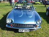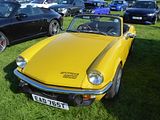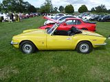 Based on the chassis and mechanicals of the Triumph Herald, the Spitfire was conceived as a rival to the Austin-Healey Sprite and MG Midget, which were launched a year earlier. The Triumph soon found a strong following, with many preferring it to the BMC cars which in time would become in-house stablemates. Mark II models arrived in 1965 and a more comprehensive facelift in 1967 with the distinctive “bone in mouth” front grille necessitated by US bumper height regulations also brought changes, but it was with the Mark IV that the greatest number of alterations would come about. The Mark IV featured a completely re-designed cut-off rear end, giving a strong family resemblance to the Triumph Stag and Triumph 2000 models, both of which were also Michelotti-designed. The front end was also cleaned up, with a new bonnet pressing losing the weld lines on top of the wings from the older models, and the doors were given recessed handles and squared-off glass in the top rear corner. The interior was much improved: a proper full-width dashboard was provided, putting the instruments ahead of the driver rather than over the centre console. This was initially black plastic however was replaced with wood in 1973. An all-new hardtop was also available, with rear quarter-lights and a flatter rear screen. By far the most significant change, however, was to the rear suspension, which was de-cambered and redesigned to eliminate the unfortunate tendencies of the original swing-axle design. The Triumph GT6 and Triumph Vitesse had already been modified, and the result on all these cars was safe and progressive handling even at the limit. The 75 hp engine was now rated at 63 hp (for UK market employing the 9:1 compression ratio and twin SU HS2 carburettors; the less powerful North American version still used a single Zenith Stromberg carburettor and an 8.5:1 compression ratio) due to the German DIN system; the actual output was the same for the early Mark IV. However, it was slightly slower than the previous Mark III due to carrying more weight, and employing a taller 3.89:1 final drive as opposed to the earlier 4.11:1. The engine continued at 1296 cc, but in 1973 was modified with larger big-end bearings to rationalise production with the TR6 2.5 litre engines, which somewhat decreased its “revvy” nature; there was some detuning, to meet new emissions laws, which resulted in the new car being a little tamer. With the overall weight also increasing to 1,717 lb (779 kg) the performance dropped as a consequence, 0 to 60 mph now being achieved in 15.8 seconds and the top speed reducing to 90 mph. The overall fuel economy also dipped to 32mpg. The gearbox gained synchromesh on its bottom gear. The Mark IV went on sale in the UK at the end of 1970 with a base price of £735. In 1973 in the United States and Canada, and 1975 in the rest of the world, the 1500 engine was used to make the Spitfire 1500. Although in this final incarnation the engine was rather rougher and more prone to failure than the earlier units, torque was greatly increased by increasing the cylinder stroke to 87.5 mm (3.44 in), which made it much more drivable in traffic. While the rest of the world saw 1500s with the compression ratio reduced to 8.0:1, the American market model was fitted with a single Zenith-Stromberg carburettor and a compression ratio reduced to 7.5:1 to allow it to run on lower octane unleaded fuel, and after adding a catalytic converter and exhaust gas recirculating system, the engine only delivered 53 bhp with a slower 0–60 time of 16.3 seconds. The notable exception to this was the 1976 model year, where the compression ratio was raised to 9.1:1. This improvement was short-lived, however, as the ratio was again reduced to 7.5:1 for the remaining years of production. In the UK the 9:1 compression ratio, less restrictive emissions control equipment, and the Type HS2 SU carburettors now being replaced with larger Type HS4 models, led to the most powerful variant to date. The 1500 Spitfire now produced 71hp (DIN) at 5500 rpm, and produced 82 lb/ft of torque at 3000 rpm. Top speed was now at the magical 100 mph mark, and 0 to 60 mph was reached in 13.2 seconds. Fuel economy was reduced to 29mpg. Further improvements to the suspension followed with the 1500 included longer swing axles and a lowered spring mounting point for more negative camber and a wider rear track. The wider, lower stance gave an impressive skid pad result of 0.87g average. This put the Spitfire head and shoulders over its competition in handling. The American market Spitfire 1500 is easily identified by the big plastic over-riders and wing mounted reflectors on the front and back wings. The US specification models up to 1978 still had chrome bumpers, but on the 1979 and 1980 models these were replaced by black rubber bumpers with built-in over-riders. Chassis extensions were also fitted under the boot to support the bumpers. Detail improvements continued to be made throughout the life of the Mark IV, and included reclining seats with “chequered brushed nylon centre panels” and head restraints, introduced for domestic market cars early in 1977 along with a new set of column stalk operated minor controls (as fitted already in the TR7) replacing the old dashboard mounted knobs and switches. Also added for the model’s final years were a wood dash, hazard flashers and an electric screen washer, in place of the previous manual pump operated ones. Options such as the hard top, tonneau cover, map light and overdrive continued to be popular, but wire wheels ceased to be available. The 1980 model was the last and the heaviest of the entire run, weighing 1,875 lb (850.5 kg). Base prices for the 1980 model year was £3,631 in the UK. The last Spitfire, an Inca Yellow UK-market model with hardtop and overdrive, rolled off the assembly line at Canley in August 1980, shortly before the factory closed. It was never sold and is now displayed at the museum at