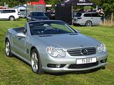 The R230 generation of the Mercedes-Benz SL-Class was introduced at the 2001 Frankfurt Motor Show and 2001 Bologna Motor Show, replacing the R129. The R230 underwent revisions in 2006 and 2008, and was superseded by the new SL-Class R231 in 2011. In early 1996, over six years into the life of the R129, development work on a successor began. On 27 January 1996, design work commenced and draft designs were submitted from ten designers in Germany, California, and Japan. Hundreds of sketches were submitted and would form the basis for twelve quarter scale models which were digitized for computer manipulation. Design of the R230 would progress through two different formats. The real world process centered on the traditional 1:4 scale models, with most of them initially being done clay. Virtual world design development took place in a room packed with state-of-the-art computer processing technology referred to as the “CAVE” (Computer Aided Virtual Environment). This technology was also used earlier on to design the W203 in 1995. The supercomputer in the “CAVE” was able to create full-size images of selected designs, using its five projectors and allowing designers to inspect every inch of every surface rendered. Parallel to the virtual process, the twelve scale models were scrutinized as well, with four standouts chosen to be created in full-size mockups. This evolution of the scale models occurred alongside the development of the interior design. On 16 June 1997, the final design for the R230 was approved by the board and refined into production specifications into 1998. The design patents for the R230 were later filed in Germany on 9 September 1999 and on 1 March 2000 in the United States. In July 2001, after over five years of development, the new SL was unveiled and introduced at the 2001 Frankfurt Motor Show that September. Production began on 13 October 2001 at the Bremen plant and European sales commenced that November. This car first appeared as the Safety Car for Formula One at the 2001 German Grand Prix in Hockenheim. The street version was unveiled at the 2001 IAA. The range was launched with a film style advertisement called Lucky Star. Tthe range soon grew from the initial SL350 and Sl500 to include the V12 engined Sl600 and SL55 AMG and SL65 AMG models, this last offering 612 PS. The SL underwent a facelift in 2006, and was unveiled at the 2006 Geneva Motor Show. Changes include new engines for SL 350 and SL 500 (called SL 550 in North America), with improved performance on SL 55 AMG and SL 600, as well as a new top-of-the-line SL 65 AMG. ABC (Active Body Control) was improved to reduce body movements in dynamic driving by up to 60%, standard on all models except the SL 350. The new engines were mated to a new 7-speed 7G-Tronic automatic, with a Sport option to allow shifting to be performed up to 30% faster in manual “M” mode, and with added steering-wheel shift paddles. Exterior styling changes include a new bumper with three large cooling air intakes and a more pronounced V-shape as well as fog lamps with chrome surrounds, new light-alloy wheels, new rear light. Interior changes include softer leather upholstery, new interior colours, high-quality metal door sills with Mercedes-Benz lettering and embossed aluminium trim elements, removable luggage cover, optional remote boot-lid release. The roof opening mechanism was also revised, reducing the opening time from 20 seconds to 16 seconds. With the 2007 model year, there was a limited production model (550 units) introduced to celebrate the 50th Anniversary of the SL roadster model. This Anniversary Edition version came with a pewter metallic exterior, cognac brown leather interior with black ash wood trim, 382 hp V8, exclusive twin-spoke rims, custom luggage bag for rear shelf, and many other standard options and features. The facelifted SL model was revealed in the Geneva Motor Show in March 2008. The SL received a new, more aggressive front end reflecting Mercedes’s new design philosophy, with a pair of long powerdomes on the bonnet and a single-bar grille replacing the old three-bar effort. Improvements have been made also on the engines. The 3.5 L V6 is uprated to 307 bhp at 6500 rpm. Compared to the previous 3.5-litre engine, the output has been boosted by 16 percent. Torque has also been improved adding 10 Nm (7.4 lb/ft) to the previous 350 Nm (258 lbf⋅ft) making it 360 N⋅m (266 lbf⋅ft). This engine now can rev up to a max of 7200 rpm for a period as the oil temperature and other engine parameters permit, a higher compression ratio, a new intake manifold and featuring extensive modifications to and lightening of the valve train. In this case, however, the extra power does not come at the expense of fuel economy: with a consumption figure of 9.9 l/100 km, the new SL 350 undercuts the previous model developing 272 PS by 0.4 l/100 km. Mercedes-Benz is extending the SL-Class line-up by introducing an attractive entry-level model in the shape of the SL 280 developing 231 PS. The six cylinder powerplant delivers its peak torque of 300 N⋅m (221 lbf⋅ft) from 2500 rpm and accelerates the roadster from 0 to 100 km/h (62 mph) in 7.8 seconds, whilst fuel consumption (NEDC) is just 9.4 L/100 km (30 mpg‑imp; 25 mpg‑US). It features the AIRSCARF heating system used in the SLK. The R221 generation cars arrived to replace the model in 2011.