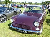 Well known now, thanks to a starring role in the Harry Potter films is the Anglia 105E, a model that Ford launched in October 1959. It was a basic car, even in the better selling De Luxe version, so it was not surprising that Ford introduced a more powerful and luxurious model from 1962, the 123E Anglia Super. It had a larger 1198 cc engine and other refinements. Towards the end of the run Ford experimented with two colours of metallic paint on the Anglia, “Blue Mink” and “Venetian Gold”. 250 were made in the Blue and 500 were made in the Gold. Anglia saloons were provided with various levels of trim. The base model was the Standard, and this sported no chromework, painted rear light surrounds, steel slatted grille and limited interior trim. The deluxe had a chrome side strip, chrome rear lights, glovebox lid, sun visor and full width chrome radiator grille while the top of the range, also seen here, was the Super, which had twin chrome side strips, contrasting coloured roof and side flash, plusher interior trim, together with the 1198 cc engine and a gearbox with synchromesh on first gear. Production concluded at the end of 1967 when the car was replaced by the Escort.
