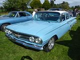 The Chevrolet Bel Air is a full-size car produced by Chevrolet for the 1950–1975 model years. Initially, only the two-door hardtops in the Chevrolet model range were designated with the Bel Air name from 1950 to 1952. With the 1953 model year, the Bel Air name was changed from a designation for a unique body shape to a premium level of trim applied across a number of body styles. The Bel Air continued with various other trim level designations, and it had gone from a mid-level trim car to a budget fleet sedan when U.S. production ceased in 1975. The Bel Air received a major redesign for the 1959 model year. The most visual new change was the flat, wing shaped tailfins. The car was built on a 119 in (3,000 mm) wheelbase and was 211 in (5,400 mm) long-which was 11 in (280 mm) longer than the 1957 model. This made Chevrolet the longest car in the low-priced range, whereas two years before it had been the shortest. In addition, the car was 3 in (76 mm) wider outside and had 5 in (130 mm) more width inside than it did in 1958, through the reduction of door thickness. The “X” frame from 1958 was continued, but enlarged and strengthened to support the new body. The Bel Air, which had been the top line series since 1953, was now the middle range. Wagons were still classed by themselves, but had model numbers matching the car series. Parkwood 6-passenger and Kingswood 9-passenger wagons had Bel Air’s model number, and as such were the middle range wagons. Under the hood, little change took place. A variety of speed options, such as fuel injection, special cams and lowered compression, gave horsepower ratings up to 315. Bel Air production was 447,100. The new Impala line surpassed Bel Air production by 20,000 units. A parking brake warning light was optional. Little change was made for 1960. The new models were refinements of the 1959 style with a much more restrained front end, the return of the double cone tail lights of 1958 rather than the startling “cat’s eyes” of 1959. Under the hood, things remained constant. Fuel injection was no longer available, but with the 348 cubic inch engine, a horsepower rating of 335 at 5800 rpm was now achieved. This involved the use of three double-barrel carburettors, a special cam and an 11.25:1 compression ratio, all sold as a package. Body style offerings followed 1959, with hardtops and sedans available. The convertible was reserved for the Impala series. The Bel Air Sport Sedan continued to use a rear window overhang and a huge wraparound rear window. Bel Airs (and Biscaynes) had two tail lights per side; the Impalas had three tail lights per side—a situation that would persist for most years through 1975. Many of the same options and accessories that were available on the Impala were also available on the Bel Air. The Bel Airs had more interior and exterior brightwork than the Biscayne.