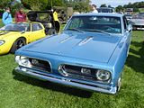 The Plymouth Barracuda is a two-door pony car that was manufactured by Chrysler Corporation from 1964 through 1974 model years. The first-generation Barracuda was based on the Chrysler A-body and was offered from 1964 until 1966. A two-door hardtop (no B-pillar) fastback design, it shared a great majority of parts and bodywork with the Plymouth Valiant, except for the huge and distinctive wraparound rear glass. The second-generation Barracuda was redesigned with model-specific sheet metal, yet still shared many components with the Valiant. It rode on a 108 in (2,743 mm) wheelbase A-body and was available as a convertible,and a notchback coupe, in addition to the fastback design. The new Barracuda was chiefly the work of John E. Herlitz and John Samsen, with Coke-bottle side contours and heavily revised front and rear ends. Design changes included wider wheel openings, curved side glass, and S-curved roof pillars on the hardtop. The roofline on the fastback coupe was more streamlined, more steeply raked, and with a much smaller flush rear window in place of the distinctive massive wraparound in the original model. Also, the overall use of chrome trim was more restrained. During this time the first U.S. Federal auto safety standards were phased in, and Chrysler’s response a requirement for side-marker lights distinguishes each model year of the second-generation Barracuda. As the pony-car class became established and competition increased, Plymouth began to revise the Barracuda’s engine options. In 1967, while the 225 cu in (3.7 L) slant-6 was still the base engine, the V8 options ranged from the two- and four-barrel versions of the 273 cu in (4.5 L) to a seldom-ordered 383 cu in (6.3 L) “B” big-block, rated at 280 bhp, the latter available only with the Formula S package. In 1968, the 273 was replaced by the 318 cu in (5.2 L) LA engine as the smallest V8 available, and the new 340 cu in (5.6 L) LA four-barrel was released. The 383 Super Commando engine was upgraded with the intake manifold, camshaft, and cylinder heads from the Road Runner and Super Bee, but the more restrictive exhaust manifolds specific to the A-body cars limited its output to 300 bhp. Also in 1968, Chrysler made approximately fifty fastback Barracudas equipped with the 426 cu in (7.0 L) Hemi for Super Stock drag racing. These cars were assembled by Hurst Performance and featured items such as lightweight Chemcor side glass, fiberglass front fenders, hood scoop, lightweight seats, sound deadener, and other street features such as rear seats omitted. An included sticker indicated that the car was not for use on public roads; it could run the quarter-mile in the mid-tens in 1968. For the South African export market, a 190 bhp high-performance version of the 225 slant-6 called Charger Power was offered with 9.3:1 compression, two-barrel carburettor, more aggressive camshaft, and low-restriction exhaust system. A handful of Savage GTs were also built from the second-generation Barracuda. In 1969, Plymouth placed an increased emphasis on performance. A new option was the Mod Top, a vinyl roof covering with a floral motif, available in 1969 and 1970. Plymouth sold it as a package with seat and door panel inserts done in the same pattern. The 1969 version of the 383 engine was upgraded to increase power output to 330 bhp, and a new trim package called ‘Cuda was released. The ‘Cuda, based on the Formula S option, was available with either the 340, 383 and, new for 1969, the 440 Super Commando V8. A third generation model was produced for 1970.