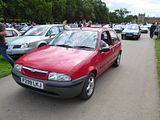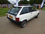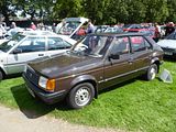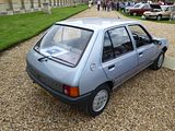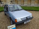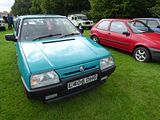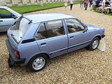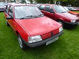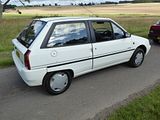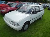 This is the AX. Development of this model started in 1983, and was initially also going to form the basis of a sister model from Talbot to replace the Samba; however, the falling popularity of the Talbot brand – coupled with the huge success of the new Peugeot 205 – had led to Peugeot deciding to axe it by the time the Citroën AX was launched, and so the Talbot version never made it into production. The car was available on the left-hand drive continental markets from its launch on 2 October 1986, as a three-door hatchback with 1.0, 1.1 and 1.4-litre TU-series belt driven OHC engines. A range of five-door models was added in 1987 and a 1.4 litre diesel engine was introduced in 1988. The latter was replaced by a 1.5 litre unit in September 1994. The right-hand drive version for the UK market was launched in August 1987, initially only as a three-door hatchback, with a five-door version joining the range a year later, effectively replacing the five-door Citroën Visa, which was discontinued that year. With the final demise of the classic Citroën 2CV in 1990, the AX became the smallest model in the Citroën range. The very earliest cars had an issue with gear shifters falling off; this was rectified by the time the AX reached export markets. It was initially backed by a memorable television advertising campaign filmed in China, starring actress Janet Mas and an elderly gentleman, whose character was simply known as Mr. Wong. The car was very economical, largely because of excellent aerodynamics for its class of car (drag coefficient of 0.31) and a very light weight of 640 kg (1,411 lb) for the basic version. This was due to the extensive use of plastic panels in non-load bearing areas and varying the thicknesses of steel in the bodyshell to be the minimum needed to take required loads. Another target for the engineers was lowering friction in the engines. The AX has fully independent suspension with unusually long wheel travel. It also optionally used self-coloured plastic bumpers. This technology came from the PSA Peugeot-Citroën / Renault / French government ECO 2000 project. The production version was much more conservative than the original ‘one box’ design prototype, that was closer to the Eco 2000 styling after negative reactions in focus groups. The “one-box” city car eventually came to market with the Renault Twingo, launched in 1992. In 1989, a naturally aspirated diesel AX, using the 1360 cc all aluminium alloy TUD engine, managed a figure of 2.7 litres/100 km (100 mpg), totalling over 1,000 miles from Dover to Barcelona. This was the longest ever distance travelled on 10 gallons of fuel and earned it a place in the Guinness Book of Records as the most economical production car. Also available was a 4×4 variant, but with limited success when compared to the rival Fiat Panda 4×4. The AX 4×4 was only available with five doors and was not sold in the United Kingdom. The first performance version was the limited-run AX Sport from 1987, with a 1.3 engine and twin carburettors producing 95 bhp, wearing iconic white steel wheels (5,5″ x 13″) which resembled those on its brother, the Peugeot 205 Rallye. The AX Sport used Solex ADDHE 40 carburettors until late 1988 and was then replaced with Weber DCOM 40s, just like the 205 Rallye 1.3. The AX Sport had a shorter inlet manifold than the 205 Rallye, to save room in the smaller engine compartment. In phase 2 guise the Sport was available in other colours and with optional GT wheels and rear spoiler. Later, the AX 14GT, with a single-carburettor 85 bhp 1.4 engine also found in the Peugeot 205 XS, was introduced. From 1991, this model utilised fuel injection to coincide with the revamp of the entire range and to coincide with tougher 1992 EU emission regulations that introduced exhaust catalytic converters. Late 1991 saw the range revised, with a heavily facelifted tailgate and interior being the most notable changes. The front turn signals were now clear, and the Citroën logo was moved to the center of the bonnet. The much maligned dashboard was replaced by a more conservative design. The following year saw the introduction of the most powerful AX variant, the 100 bhp GTi. The GT was sold alongside the GTi for a few months, but was eventually phased out. New models were also introduced, such as the Forte, Spree, Elation and Dimension. In January 1995, the Citroën AX Echo was launched, with a top speed of 110 mph (180 km/h). Its closest competitor, the Peugeot 106 Ski, (that shared components with the AX), was outsold by the Echo. From June 1996, following the introduction of the Saxo, the range was slimmed-down, with production of the AX ending in December 1998, after a 12-year production run. It had been withdrawn from the UK market during the first half of 1997, following the demise of right-hand drive production. A total of 2,425,138 AXs were produced.