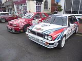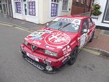 The 155 was one of a series of cars built by the Fiat Group on a shared platform, the so called Tipo 3 or Tipo Tre, which sat under the Fiat Tipo, and Lancia Delta 2, as well as the Fiat Coupe. Built to replace the rear wheel drive 75, the 155 was somewhat larger in dimension than its predecessor. The 155 was designed by Italian design house I.DE.A Institute which achieved an exceptional drag coefficient of 0.29, and the rather boxy design gave the car a sizeable boot, as well. The single most significant technical change from the 75 was the change to a front-wheel drive layout. This new configuration gave cost and packaging benefits but many Alfa die-hards and the automotive press lamented the passing of the “purer” rear-wheel drive layout on a car from this sporting marque. Not even the availability of the 155 Q4, which had a 2.0-litre turbocharged engine and a permanent four-wheel drive powertrain, both derived from the Lancia Delta Integrale; making the car essentially a Lancia Delta Integrale with a different body was enough to win the sceptics over. Reception of the model was generally lukewarm. The 75 had been conceived prior to Fiat’s acquisition of the Alfa brand, so as “the last real Alfa” it cast rather a shadow over the 155; the loss of rear-wheel drive was frequently cited as the main cause of the disappointment. Nevertheless, the 155 was entered in Touring Car racing and was successful in every major championship it entered, which gradually improved its image. Belatedly, the factory introduced a wider version in 1995 (the “wide-body”) which as well as a wider track and revised steering based on racing experience or requirements, also brought in new 16-valve engines for the 1.8 and 2.0-litre whilst retaining the 2.5 V6 and making some improvements to cabin materials and build quality. There were several Sport Packs available, including a race-inspired body kit (spoiler and side skirts) and black or graphite-coloured 16-inch Speedline wheels. The more genteel could opt for the Super which came with wood inserts in the cabin and silver-painted alloy wheels. With this version, the 155 really came good. When production ceased in 1998, following the launch of the 156, 192,618 examples had been built. It was the very rare Q4 which was to be seen here. The 155 was very successful in touring car racing, using the Supertouring-homologated GTA and the V6 TI for the DTM. The Alfa Romeo 155 V6 TI was a FIA Class 1 touring car which was powered by a high-revving 2.5 litre 60° V6 engine, coupled to a four wheel drive system, producing 400 PS at 11500 rpm. Alfa Corse entered two 155 V6 TIs for works drivers Alessandro Nannini and Nicola Larini; the 1993 season was dominated by Larini winning 11 of 22 races, In 1994 the rivals from Mercedes seemed to have the advantage but Alfa did manage to win a further 11 races. A more consistent performance from the Germans gave them the title. In the UK in 1993, Larini in an Alfa 155 was placed second in the FIA Touring Car Challenge behind Paul Radisich in a Ford Mondeo. Between 1992 and 1994, the 155 also managed to take the Italian Superturismo Championship, the Spanish Touring Car Championship (with Adrián Campos), and the British Touring Car Championship (with Gabriele Tarquini). For the 1995 season the team got new sponsorship livery from Martini Racing. The 1996 version had a 2.5 litre 90° V6 engine based loosely on the PRV engine delivering 490 PS at 11,900 rpm, had a top speed of around 300 km/h (190 mph) and weighed 1,060 kilograms. The 155 remained competitive until it was replaced with the 156, finishing third in the DTM (then known as the International Touring Car Championship, or ITC) in 1996 with Alessandro Nannini and winning the Spanish championship again in 1997 with Fabrizio Giovanardi. All told, the Alfa 155 V6 TI achieved a total off 38 wins (plus 3 other non-championship races). The victories were obtained by seven different drivers: 17 (+1) Nicola Larini, 13 (+1) Alessandro Nannini, 2 Stefano Modena, 2 (+1) Christian Danner, 2 Michael Bartels, 1 Kris Nissen and 1Gabriele Tarquini. In the UK, the car is best remembered for its winning ways in the Touring Car Championship (my 1995 Alfa had a sticker in the rear window reminding everyone of the fact), The 156 was to continue the high standard set by the 155, winning the European Touring Car Championship multiple times. The car seen here is not actually one of the original race cars, but a recreation in homage to this successful career.