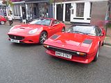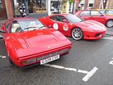 With styling that had a close link to the Testarossa, the next V8 Ferrari to be launched, in 1989, was the 348, as a replacement for the 328 GTB/GTS models, and there were several examples of this model here. At launch, the 348 series were not that enthusiastically received by the press who found much to complain about. The 348’s styling differed from previous models with straked side air intakes and rectangular taillights resembling the Testarossa. Launched in two models, a coupe badged 348 tb (Trasversale Berlinetta) and targa roofed 348 ts (Targa), these were soon joined by a fully open car, the 348 Spider. All featured a normally aspirated 3.4-litre version of the quad-cam, four-valve-per-cylinder V8 engine. As with its predecessors, the model number was derived from this configuration, with the first two digits being the displacement and the third being the number of cylinders. The engine, which produced 300 hp was mounted longitudinally and coupled to a transverse manual gearbox, like the Mondial t with which the 348 shared many components. This was a significant change for Ferrari, with most previous small Ferraris using a transverse engine with longitudinal transmission. The “T” in the model name 348 tb and ts refers to the transverse position of the gearbox. The 348 was fitted with dual-computer engine management using twin Bosch Motronic ECUs, double-redundant anti-lock brakes, and self-diagnosing air conditioning and heating systems. Late versions (1993 and beyond) have Japanese-made starter motors and Nippondenso power generators to improve reliability, as well as the battery located within the front left fender for better weight distribution. Similar to the Testarossa but departing from the BB 512 and 308/328, the oil and coolant radiators were relocated from the nose to the sides, widening the waist of the car substantially, but making the cabin much easier to cool since hoses routing warm water no longer ran underneath the cabin as in the older front-radiator cars. This also had the side effect of making the doors very wide. The 348 was equipped with a dry-sump oil system to prevent oil starvation at high speeds and during hard cornering. The oil level can only be accurately checked on the dipstick when the motor is running due to this setup. The 348 was fitted with adjustable ride-height suspension and a removable rear sub-frame to speed up the removal of the engine for maintenance. Despite trenchant criticism of the car, especially its handling, 2,895 examples of the 348 tb and 4,230 of the 348 ts were produced. Seen here were both the 348 tb and ts models.