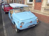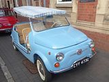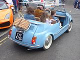 Known for being the car which really put Italy on wheels, the 500 Topolino was one of the smallest cars in the world at the time of its production. Launched in 1937, three versions were produced until 1955, all with only minor mechanical and cosmetic changes. It was equipped with a 569 cc four-cylinder, side-valve, water-cooled engine mounted in front of the front axle, which meant that it was a full-scale car rather than a cyclecar. The radiator was located behind the engine which made possible a lowered aerodynamic nose profile at a time when competitors had a flat, nearly vertical grille. The shape of the car’s front allowed exceptional forward visibility. The rear suspension initially used quarter-elliptic rear springs, but buyers frequently squeezed four or five people into the nominally two-seater car, and in later models the chassis was extended at the rear to allow for more robust semi-elliptic springs. With horsepower of about 13 bhp, its top speed was about 53 mph and it could achieve about 48 mpg. The target price given when the car was planned was 5,000 lire. In the event the price at launch was 9,750 lire, though the decade was one of falling prices in several part of Europe and later in the 1930s the Topolino was sold for about 8,900 lire. Despite being more expensive than first envisioned, the car was competitively priced and nearly 520,000 were sold. Nowadays the car seen here is known as the 500A, and this shares its body with the later 500 Model B, but the later car had more power, a heady 16 hp. It was made between 1948 and 1949. The Model A was offered as a 2-door coupé, 2-door cabriolet and a 2-door van, while the Model B also introduced a 3-door estate under the name 500 B Giardinetta (“estate car”). The Model C was introduced in 1949 with a restyled body and the same engine as Model B, and was offered in 2-door coupé, 2-door cabriolet, 3-door estate and 2-door van versions. In 1952, the Giardinetta was renamed the Belvedere (“A turret or other raised structure offering a pleasant view of the surrounding area”, referring to its sunroof). The car seen here, belonging to Jackie Kowaleski, may look pretty standard but under that body, it is anything but, as the car has a 2 litre Ford engine which makes it considerably more rapid than the original car. She has had to re-engineer the chassis to take this much bigger engine, and also upgrade the brakes and suspension, so the car is now quite a rocket.