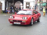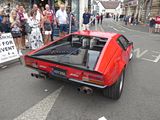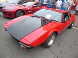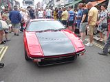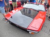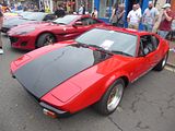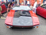 Designed by American Tom Tjaarda, and unlike the Mangusta, which employed a steel backbone chassis, the Pantera was a steel monocoque design, the first instance of De Tomaso using this construction technique. The Pantera logo included a version of Argentina’s flag turned on its side with a T-shaped symbol that was the brand used by De Tomaso’s Argentinian cattle ranching ancestors. The car made its public debut in Modena in March 1970 and was presented at the 1970 New York Motor Show a few weeks later. Approximately a year later the first production Panteras were sold, and production was increased to three per day. The curious slat-backed seats which had attracted comment at the New York Show were replaced by more conventional body-hugging sports-car seats in the production cars: leg-room was generous but the pedals were off-set and headroom was insufficient for drivers above approximately 6 ft. Reflecting its makers’ transatlantic ambitions, the Pantera came with an abundance of standard features which appeared exotic in Europe, such as electric windows, air conditioning and even “doors that buzz when … open”. By the time the Pantera reached production, the interior was in most respects well sorted, although resting an arm on the central console could lead to inadvertently activating the poorly located cigarette lighter. The first 1971 Panteras were powered by a Ford 351 cu in (5.8 litre) V8 engine that produced a severely underrated 330 hp. Stock dynos over the years proved that power was more along the lines of about 380 hp. The high torque provided by the Ford engine reduced the need for excessive gear changing at low speeds: this made the car much less demanding to drive in urban conditions than many of the locally built competitor products. The ZF transaxle used in the Mangusta was also used for the Pantera: a passenger in an early Pantera recorded that the mechanical noises emanating from the transaxle were more intrusive than the well restrained engine noise. Power-assisted four-wheel disc brakes and rack and pinion steering were all standard equipment on the Pantera. The 1971 Pantera could accelerate to 60 mph in 5.5 seconds. In the summer of 1971, a visitor to the De Tomaso plant at Modena identified two different types of Pantera awaiting shipment, being respectively the European and American versions. From outside, the principal differences were the larger tail lamps on the cars destined for America, along with addition of corner marker lamps. The visitor was impressed by the large number of cars awaiting shipment; but in reality, spending the best part of a year under dust covers in a series of large hangars probably did nothing for the cash-flow of the business or the condition of some of the cars by the time they crossed the Atlantic. Late in 1971, Ford began importing Panteras for the American market to be sold through its Lincoln Mercury dealers. The first 75 cars were simply European imports and are known for their “push-button” door handles and hand-built Carrozzeria Vignale bodies. A total of 1,007 Panteras reached the United States that first year. These cars were poorly built, and several Panteras broke down during testing on Ford’s test track. Early crash testing at UCLA showed that safety cage engineering was not very well understood in the 1970s. Rust-proofing was minimal on these early cars, and the quality of fit and finish was poor, with large amounts of body solder being used to cover body panel flaws. Notably, Elvis Presley once fired a gun at his Pantera after it would not start. An L model (“Lusso”) was added in 1972 and a GTS version in 1974, but it was not enough and Ford ended their importation to the US in 1975, having sold around 5,500 cars. De Tomaso continued to build the car in ever-escalating forms of performance and luxury for almost two decades for sale in the rest of the world. A small number of Panteras were imported to the US by grey market importers in the 1980s, notably Panteramerica and AmeriSport. After 1974, Ford US discontinued the Cleveland 351 engine, but production continued in Australia until 1982. De Tomaso started sourcing their V8s from Australia once the American supplies dried up. These engines were tuned in Switzerland and were available with a range of outputs up to 360 PS. The chassis was completely revised in 1980, beginning with chassis number 9000. From May 1980 the lineup included the GT5, which had bonded and riveted-on fibreglass wheelarch extensions and from November 1984 the GT5S model which had blended arches and a distinctive wide-body look. The GT5 also incorporated better brakes, a more luxurious interior, much larger wheels and tires and the fibreglass body kit also included an air dam and side skirts. Production of the wide body GT5 (and similarly equipped narrow body GTS models) continued until 1985, when the GT5-S replaced the GT5. Although the factory has not made its records available, an analysis based on Vehicle Identification Numbers by the Pantera Owners Club of America (POCA) late model (9000 series) registrar has shown that fewer than 252 GT5 Panteras were likely to have been built. The GT5-S featured single piece flared steel fenders instead of the GT5’s riveted-on fibreglass flares, and a smaller steel front air dam. The ‘S’ in the GT5-S name stood for “steel”. Otherwise the GT5-S was largely identical to the GT5. The POCA 9000 series registrar’s VIN analysis indicates that fewer than 183 GT5-S Panteras were built. Concurrent GTS production continued, on a custom order and very limited basis, until the late 1980s. The car continued to use a Ford V8 engine, although in 1988, when the supply of Ford 351 Cleveland engines from Australia ran out, De Tomaso began installing Ford 351 Windsor engines in the Pantera instead. For 1990 the 351 was changed to the Ford 302 cu in (4942 cc, commonly called a “5.0”). Incorporating a Marcello Gandini facelift, suspension redesi