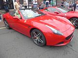 After a gap of some years, Ferrari added a 4 seater V8 model to the range at the 2008 Paris Motor Show, with the California. According to industry rumours, the California originally started as a concept for a new Maserati, but the resulting expense to produce the car led the Fiat Group to badge it as a Ferrari in order to justify the high cost of purchase; the company denies this, however. The California heralded a number of firsts for Ferrari: the first front engined Ferrari with a V8; te first to feature a 7-speed dual-clutch transmission; the first with a folding metal roof; the first with multi-link rear suspension; and the first with direct petrol injection. Bosch produced the direct injection system. The engine displaces 4,297 cc, and used direct injection. It delivered 453 bhp at 7,750 rpm; its maximum torque produced was 358 lbf·ft at 5,000 rpm. The resulting 106 bhp per litre of engine displacement is one of the highest for a naturally aspirated engine, as other manufacturers have used supercharging or turbocharging to reach similar power levels. Ferrari spent over 1,000 hours in the wind tunnel with a one-third-scale model of the California perfecting its aerodynamics. With the top up, the California has a drag coefficient of Cd=0.32, making it the most aerodynamic Ferrari ever made until the introduction of the Ferrari F12 Berlinetta. Throughout the California’s production, only 3 cars were built with manual transmission, including one order from the UK. On 15 February 2012, Ferrari announced an upgrade, which was lighter and more powerful. Changes include reducing body weight by 30 kg (66 lb), increased power by output of 30 PS and 11 lb/ft, acceleration from 0–100 km/h (62 mph) time reduced to 3.8 seconds, introduction of Handling Speciale package and elimination of the manual transmission option. The car was released at the 2012 Geneva Motor Show as a 2012 model in Europe. To give the clients a more dynamic driving experience, an optional HS (Handling Speciale) package was developed as part of the update. It can be recognised by a silver coloured grille and ventilation blisters behind the front wheel wells. The HS package includes Delphi MagneRide magnetorheological dampers controlled by an ECU with 50% faster response time running patented Ferrari software, stiffer springs for more precise body control and a steering rack with a 9 per cent quicker steering ratio (2.3 turns lock to lock as opposed to the standard rack’s 2.5). A more substantive update came in 2014, with the launch of the California T, which remains in production. It featured new sheetmetal, a new interior, a revised chassis and a new turbocharged powertrain.
