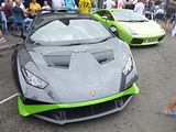 The Huracán STO (Super Trofeo Omologato) i s a track focused variant of the Huracan. It is completely different from other Huracan variants. The STO has a taller rear wing with a roof snorkel for engine cooling. There is a shark fin aerodynamic device connecting the roof snorkel with the rear wing. The engine cover is reminiscent of the Lamborghini Super Trofeo Evo race cars. The entire hood opens to reveal a small compartment for storing racing equipment, the body is made of 75% carbon fibre, the engine and the power output of the STO is the same as the Huracan Perfomante and the Huracan Evo but it has Rear-wheel drive with Rear Wheel Steering system, it has CCMR Brakes inspired from Formula 1. The STO comes with three new modes: STO for road driving, TROFEO for fast lap times on dry tarmac, and PIOGGIA for wet weather driving. The bucket seats on the interior feature racing harnesses.