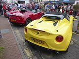 The Alfa Romeo 4C is a two-seater, rear-wheel drive coupé with technology and materials derived from the Alfa Romeo 8C Competizione, with a 1750 cc turbo petrol engine with direct injection, the “Alfa TCT” twin dry clutch transmission, and the Alfa DNA dynamic control selector. The 4C concept version was unveiled in the 81st Geneva Motor Show in March 2011, followed by the Mille Miglia 2011 parade, Goodwood Festival of Speed 2011,2011 Frankfurt Motor Show. It was displayed for the first time outside in Concorso d’Eleganza Villa d’Este in 2012. Compared to the production version, it is very similar, with the biggest differences being front lights, side vents and mirrors. The Alfa Romeo 4C Concept was voted the ‘Most Beautiful Concept Car of the Year’ award by the readers of German magazine Auto Bild, and won the Auto Bild Design Award 2011. It was awarded the “Design Award for Concept Cars & Prototypes” by referendum of the public in Villa d’Este. The production car was unveiled at the 2013 Geneva Motor Show, followed by 2013 Essen ‘Techno Classica’, Goodwood Festival of Speed 2013, Moscow Raceway, 2013 Frankfurt Motor Show. The bare ‘4C000’ chassis was also shown at the 2013 Geneva Motor Show. Ordering of European models began in October 2013 at Alfa Romeo dealerships in Europe. As part of the Alfa Romeo 4C launch, Alfa Romeo Style Centre and Compagnia Ducale designed a 4C IFD (Innovative Frame Design) Bicycle, inspired by the Alfa Romeo 4C coupé. The vehicle went on sale in December 2013 and marketed in Europe, Asia and America. Production of the 4C began May 2013 at Maserati’s plant in Modena, with an expected production of up to 2500 units per year. It was the first mass-produced Alfa Romeo model to be sold in the US market since 1995 when the 164 sedan stopped being sold in the US. Production of the Alfa Romeo 4C was originally estimated to be over 1000 units per year, with an upper limit of 3500 units per year, depending on the quantity of carbon fibre chassis that can be built by the supplier Adler Plastic.Within the 3,500-unit quota, 1,000 units are earmarked for Europe. Delivery of the European Alfa Romeo 4C Launch Edition took place at Balocco (Vercelli, Italy) Test Centre. In 2018, the 4C coupe was discontinued for the North American market. The 4C Spider, however continued to be sold there for model year 2019 and model year 2020. In other markets, such as Australia and Japan, both the coupe and Spider continued. In late 2020, a new tribute-edition named the 4C Spider 33 Stradale Tributo was announced. The car was designed by Centro Stile Alfa Romeo (Style Centre) and developed by Alfa Romeo. The chassis is composed of a central carbon fibre tub, with aluminium subframes front and rear. The carbon fibre tub is produced by TTA (Tecno Tessile Adler) in Airola, as a joint venture between Adler Plastic and Lavorazione Materiali Compositi. The carbon fibre components that make up the chassis are cut using CNC technology. The entire carbon-fibre monocoque chassis (“tub”) of the car weighs 143 pounds (65 kg). Front and rear aluminium subframes combine with the tub, roof reinforcements and engine mounting to comprise the 4C chassis giving the vehicle a total chassis weight of 236 lb (107 kg) and a total vehicle curb weight of just 2,465 lb (1,118 kg). The 4C has a single carbon fibre body, similar to the body of many supercars. The outer body is made of a composite material (SMC for Sheet Moulding Compound) which is 20% lighter than steel. The stability is comparable to steel and better than aluminium. The 4C employs double wishbone suspensions at the front and MacPherson struts at the rear. The resultant weight distribution is 38% on the front and 62% on the rear axle. Wheels and tyres have different diameters and widths front and rear: 205/45 R17 front and 235/40 R18 back as standard, with optional 205/40 R18 and 235/35 R19. Both wheel options come equipped with Pirelli P Zero tyres. The 4C uses vented disc brakes on all wheels; Brembo 305 millimetres (12.0 in) on the front and 292 millimetres (11.5 in) on the rear. The car can stop from 100 km/h (62 mph) in 36 metres. To save weight and increase steering feel, the 4C has no power steering. Its centre of gravity height, at 40 centimetres (16 in) off the ground, is 7 centimetres (2.8 in) lower than that of the Lotus Elise. The 4C uses a new all-aluminium 1,742 cc inline 4 cylinder turbocharged engine producing 240 PS at 6000 rpm. The engine has been designed for minimum weight. The engine’s combined fuel consumption 6.8 l/100 km (42 mpg‑imp; 35 mpg‑US).[4] 0–62 mph (0–100 km/h) acceleration is achieved in 4.5 seconds and the top speed is 258 km/h (160 mph), the power-to-weight-ratio being just 0.267 hp/kg (8.22 lb/hp) A journalist from Quattroruote car magazine demonstrated how the 4C accelerates from 0–100 km/h (0–62 mph) faster than 4.5 seconds. In race mode, with left foot on the brake pedal, if you pull the right shift paddle the engine will rev to 3500 rpm, but if you also pull the left paddle the engine will rev to 6000 rpm and 0–100 km/h (0–62 mph) time will go down to 4.2 seconds. Italian car magazine Quattroruote published the lap time of 4C around Nürburgring. It lapped the ring in 8:04. The 4C is equipped with a six speed Alfa TCT Dual Dry Clutch Transmission, and can be operated via gearshift paddles on the steering wheel. It also has an Alfa ‘DNA’ dynamic control selector which controls the behaviour of engine, brakes, throttle response, suspension and gearbox. In addition to the modes already seen in Giulietta, the 4C has a new “Race” mode. The U.S. version of the 4C was introduced in the 2014 New York International Auto Show with the first 100 4C’s being shipped to the U.S. early July, with a total of 850 being shipped by the end of 2014. The U.S. model includes extra bracing and strengthening required to meet U.S. crash regulations (including aluminium inse