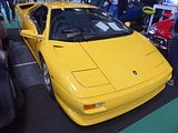 At a time when the company was financed by the Swiss-based Mimran brothers, Lamborghini began development of what was codenamed Project 132 in June 1985 as a replacement for the Countach model. The brief stated that its top speed had to be at least 315 km/h (196 mph). The design of the car was contracted to Marcello Gandini, who had designed its two predecessors. When Chrysler bought the company in 1987, providing money to complete its development, its management was uncomfortable with Gandini’s designs and commissioned its design team in Detroit to execute a third extensive redesign, smoothing out the trademark’s sharp edges and corners of Gandini’s original design, and leaving him famously unimpressed. In fact, Gandini was so disappointed with the “softened” shape that he would later realise his original design in the Cizeta-Moroder V16T. The car became known as the Diablo, carrying on Lamborghini’s tradition of naming its cars after breeds of fighting bulls. The Diablo was named after a ferocious bull raised by the Duke of Veragua in the 19th century, famous for fighting an epic battle with ‘El Chicorro’ in Madrid on July 11, 1869 In the words of Top Gear presenter Jeremy Clarkson, the Diablo was designed “solely to be the biggest head-turner in the world.” The Diablo was presented to the public for sale on January 21, 1990. Its power came from a 5.7 litre 48-valve version of the existing Lamborghini V12 featuring dual overhead cams and computer-controlled multi-point fuel injection, producing a maximum output of 499 PS and 580 N·m (428 lb/ft) of torque. The vehicle could reach 100 km/h in about 4.5 seconds, with a top speed of 202 mph. The Diablo was rear-wheel drive and the engine was mid-mounted to aid its weight balance. The Diablo came better equipped than the Countach; standard features included fully adjustable seats and steering wheel, electric windows, an Alpine stereo system, and power steering from 1993 onwards. Anti-lock brakes were not initially available, although they would eventually be used. A few options were available, including a custom-moulded driver’s seat, remote CD changer and subwoofer, rear spoiler, factory fitted luggage set and an exclusive Breguet clock for the dash. The Diablo VT was introduced in 1993. Although the VT differed from the standard Diablo in a number of ways, by far the most notable change was the addition of all wheel drive, which made use of a viscous centre differential (a modified version of LM002’s 4WD system). This provided the new nomenclature for the car (VT stands for viscous traction). The new drivetrain could direct up to 25% of the torque to the front wheels to aid traction during rear wheel slip, thus significantly improving the handling characteristics of the car. Other improvements debuting on the VT included front air intakes below the driving lamps to improve brake cooling, larger intakes in the rear arches, a more ergonomic interior with a revised dashboard, electronically adjustable dampers, four-piston brake calipers, power steering, and minor engine refinements. Many of these improvements, save the four-wheel drive system, soon transferred to the base Diablo, making the cars visually nearly identical. Further updates would follow before the car gave way to the Murcielago in 2001. The Diablo sold in greater numbers than its predecessor with 2898 examples being made during its 11 year production life.  There were several here, including the VT and the SV, a few of them were the late model cars with their faired-in headlights.