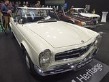 By 1955, Mercedes-Benz Technical Director Prof. Fritz Nallinger and his team held no illusions regarding the 190 SL’s lack of performance, while the high price tag of the legendary 300 SL supercar kept it elusive for all but the most affluent buyers. Thus Mercedes-Benz started evolving the 190 SL on a new platform, model code W127, with a fuel-injected 2.2 litre M127 inline-six engine, internally denoted as 220SL. Encouraged by positive test results, Nallinger proposed that the 220SL be placed in the Mercedes-Benz program, with production commencing in July 1957. However, while technical difficulties kept postponing the production start of the W127, the emerging new S-Class W112 platform introduced novel body manufacturing technology altogether. So in 1960, Nallinger eventually proposed to develop a completely new 220SL design, based on the “fintail” W 111 sedan platform with its chassis shortened by 11.8 in, and technology from the W112. This led to the W113 platform, with an improved fuel-injected 2.3 litre M127 inline-six engine and the distinctive “pagoda” hardtop roof, designated as 230 SL. The 230 SL made its debut at the prestigious Geneva Motor Show in March 1963, where Nallinger introduced it as follows: “It was our aim to create a very safe and fast sports car with high performance, which despite its sports characteristics, provides a very high degree of travelling comfort”. The W113 was the first sports car with a “safety body,” based on Bela Barényi’s extensive work on vehicle safety: It had a rigid passenger cell and designated crumple zones with impact-absorbing front and rear sections built into the vehicle structure. The interior was “rounded,” with all hard corners and edges removed, as in the W111 sedan. Production of the 230 SL commenced in June 1963 and ended on 5 January 1967. Its chassis was based on the W 111 sedan platform, with a reduced wheelbase by 11.8 in, recirculating ball steering (with optional power steering), double wishbone front suspension and an independent single-joint, low-pivot swing rear-axle with transverse compensator spring. The dual-circuit brake system had front disc brakes and power-assisted rear drum brakes. The 230 SL was offered with a 4-speed manual transmission, or an optional, very responsive fluid coupled (no torque converter) 4-speed automatic transmission, which was popular for US models. From May 1966, the ZF S5-20 5-speed manual transmission was available as an additional option, which was particularly popular in Italy. The 2,308 cc M127.II inline-six engine with 150 hp and 145 lb/ft torque was based on Mercedes-Benz’ venerable M180 inline-six with four main bearings and mechanical Bosch multi-port fuel injection. Mercedes-Benz made a number of modifications to boost its power, including increasing displacement from 2,197 cc, and using a completely new cylinder head with a higher compression ratio (9.3 vs. 8.7), enlarged valves and a modified camshaft. A fuel injection pump with six plungers instead of two was fitted, which allowed placing the nozzles in the cylinder head and “shooting” the fuel through the intake manifold and open valves directly into the combustion chambers. An optional oil-water heat exchanger was also available. Of the 19,831 230 SLs produced, less than a quarter were sold in the US. Looking identical, the 250 SL was introduced at the 1967 Geneva Motor Show. Production had already commenced in December 1966 and ended in January 1968. The short one-year production run makes the 250 SL the rarest of the W113 series cars. The 250 SL retained the stiffer suspension and sportier feel of the early SLs, but provided improved agility with a new engine and rear disc brakes. Range also improved with increased fuel tank capacity from 65 litres to 82. Like its predecessor, the 250 SL was offered with a 4-speed automatic transmission, and 4-speed or ZF 5-speed manual transmissions.  For the first time, an optional limited slip differential was also available. The main change was the use of the 2,496 cc M129.II engine with a larger stroke, increased valve ports, and seven main bearings instead of four. The nominal maximum power remained unchanged at 150 hp, but torque improved from 145 lb/ft to 159 lb/ft. Resiliency also improved with a new cooling water tank (“round top”) with increased capacity and a standard oil-water heat exchanger. The 250 SL also marked the introduction of a 2+2 body style, the so-called “California Coupé”, which had only the removable hardtop and no soft-top: a small fold-down rear bench seat replaced the soft-top well between passenger compartment and boot. It is estimated that only 10% of the 250SLs that were brought into America were California Coupes. Of the 5,196 250 SLs produced, more than a third were sold in the US.The 280 SL was introduced in December 1967 and continued in production through 23 February 1971, when the W 113 was replaced by its successor, the entirely new and substantially heavier R107 350 SL. The main change was an upgrade to the 2,778 cc M130 engine with 170 hp and 180 lb/ft, which finally gave the W 113 adequate power. The performance improvement was achieved by increasing bore by 4.5 mm (0.2 in), which stretched the limits of the M180 block, and required pairwise cylinder casts without cooling water passages. This mandated an oil-cooler, which was fitted vertically next to the radiator. Each engine was now bench-tested for two hours prior to being fitted, so their power specification was guaranteed at last. The M130 marked the final evolution of Mercedes-Benz’ venerable SOHC M180 inline-six, before it was superseded by the entirely new DOHC M110 inline-six introduced with R107 1974 European 280 SL models. For some time, it was also used in the W 109 300 S-Class, where it retired the expensive 3 liter M189 alloy inline-six. Over the years, the W 113 evolved from a sports car into a comfortable grand tourer, and US models were by t