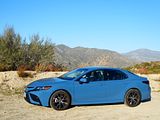 The 2022 Toyota Camry is available in six trim levels: LE, SE, SE Nightshade, XSE, XLE and TRD. A four-cylinder and an available V6 engine are offered. You can also get all-wheel drive with the four-cylinder. Even the entry level LE has a good standard of equipment. Standard feature highlights include: 203 bhp four-cylinder engine with eight-speed automatic transmission, 17-inch wheels, LED headlights, a power-adjustable driver’s seat; dual-zone automatic climate control, a 7-inch infotainment touchscreen including support for Apple CarPlay and Android Auto smartphone integration and 60/40-split folding rear seats. All Camrys also come standard with a suite of driver aids that include: Forward collision mitigation, Lane keeping assist, Adaptive cruise control, Automatic high-beam headlights and Road sign recognition. The SE adds sporty touches and extra features, such as unique exterior trim, 18-inch wheels, simulated leather upholstery, a leather-wrapped steering wheel with paddle shifters, sport-tuned suspension and automatic climate control. The SE Nightshade aims for a more stealthy look, adding distinctive 18-inch wheels, black exterior trim and a boot-mounted spoiler. The XLE adds more upscale features to the LE, such as: Full-speed adaptive cruise control; blind-spot monitor; keyless entry and push-button ignition; leather upholstery; a power-adjustable front passenger seat, heated front seats; an upgraded driver information display; a 9-inch information touchscreen; a wireless charging pad and rear air vents. The XSE is similar to the XLE but adds a more sporty look and feel with 206 bhp for the four-cylinder engine, sport-tuned suspension, 19-inch wheels, a gloss black grille, a dual exhaust and metallic interior trim. The TRD is the most athletic of Camrys with a 301-hp V6 engine, black-painted outside mirrors and exterior trim, unique 19-inch wheels, aerodynamic body trim, TRD-specific simulated leather upholstery and red seat belts, a sport exhaust and special sport-tuned suspension. Some features on the XLE and XSE are available on the LE and SE as options. Toyota also offers the 301-hp V6 engine as an option for the XSE and XLE trims. Other notable optional features include a Driver Assist package which comprises a 360-degree camera system (gives you a top-down view of the Camry and its surroundings for tight parking situations), a head-up display (standard with V6), rear automatic braking (brakes if sensors detect an imminent collision with an object behind the vehicle) and ventilated front seats. There is also a Cold Weather package with heated front seats, heated mirrors and a heated steering wheel. Other options include an integrated navigation system with nine-speaker JBL sound system, a panoramic sunroof (standard with the V6) and performance tyres (TRD only).