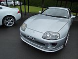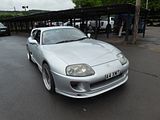 This Supra is from the fourth generation of the model, known as the A80. Design work began in February 1989 under various teams for design, product planning, and engineering. By the middle of 1990, a final A80 design concept from Toyota Technical Centre Aichi was approved and frozen for production in late 1990. The first test mules were hand-built in A70 bodies during late 1990, followed by the first A80 prototypes being hand-assembled in 1991. Again using subframe, suspension, and drivetrain assemblies from the Z30 Soarer (Lexus SC300/400), test model pre-production started in December 1992 with 20 models, and official mass production began in April 1993. This redesign saw Toyota placing great emphasis on a more serious high-performance car. The new Supra was completely redesigned, with rounded body styling and featured two new engines: a naturally aspirated Toyota 2JZ-GE producing 220 hp at 5800 rpm and 210 lb/ft at 4800 rpm of torque and a twin turbocharged Toyota 2JZ-GTE making 276 hp and 318 lb·ft of torque for the Japanese version. The styling, while modern, does seem to borrow some elements from Toyota’s first grand touring sports car, the Toyota 2000GT. For the export model (America/Europe) Toyota upgraded the Supra turbo’s engine which increased the power output to 320 hp at 5600 rpm and 315 lb/ft at 4000 rpm. The turbocharged variant could achieve 0–60 mph in as low as 4.6 seconds and 1/4-mile in 13.1 seconds at 109 mph. The turbo version was tested to reach over 285 km/h (177 mph), but the cars were restricted to just 180 km/h (112 mph) in Japan and 250 km/h (155 mph) elsewhere. The twin turbos operated in sequential mode, not parallel. Initially, all of the exhaust is routed to the first turbine for reduced lag. This resulted in boost and enhanced torque as early as 1800 rpm, where it already produced 300 lb/ft (410 Nm) of torque. At 3500 rpm, some of the exhaust is routed to the second turbine for a “pre-boost” mode, although none of the compressor output is used by the engine at this point. At 4000 rpm, the second turbo’s output is used to augment the first turbo’s output. Compared to the parallel mode, sequential mode turbos provide quicker low RPM response and increased high RPM boost. This high RPM boost was also aided with technology originally present in the 7M-GE in the form of the Acoustic Control Induction System (ACIS) which is a way of managing the air compression pulses within the intake piping as to increase power. For this generation, the Supra received a new 6-speed Getrag/Toyota V160 gearbox on the turbo models while the naturally aspirated models made do with a 5-speed manual W58, revised from the previous version. Each model was offered with a 4-speed automatic with manual shifting mode. All vehicles were equipped with 5-spoke aluminium alloy wheels, the naturally aspirated model had 16″ rims and the turbo models were 17″. The difference in wheel size was to accommodate the larger brakes equipped as standard onto the turbo model, but in Japan were optional extras. Both models had a space saver spare tire on a steel rim to save both space and weight. Toyota took measures to reduce the weight of this new model. Aluminium was used for the hood, targa top (when fitted), front crossmember, oil and transmission pans, and the suspension upper A-arms. Other measures included hollow carpet fibres, magnesium-alloy steering wheel, plastic gas tank and lid, gas injected rear spoiler, and a single pipe exhaust. Despite having more features such as dual airbags, traction control, larger brakes, wheels, tyres, and an additional turbo, the car was at least 200 lb lighter than its predecessor. The base model with a manual transmission had a curb weight of 3,210 lb (1,460 kg). The Sport Roof added 40 lb while the automatic transmission added 55 lb. It had a 51:49 (front:rear) weight distribution. The turbo model weighed 3,450 lb (1,560 kg) for the manual, automatic added another 10 lb (4.5 kg). Weight distribution was 53% front/47% rear. The Supra was heavier than the spartan Mazda RX-7 and all aluminium bodied Acura/Honda NSX, but it was lighter than the Mitsubishi 3000GT VR-4. The Supra soon became something of a legend, establishing itself as an effective platform for drifting in Japan, and for roadracing, with several top 20 and top 10 One Lap of America finishes in the SSGT1 class. Despite its curb weight, in 1994 the A80 managed remarkable skidpad ratings of 0.95 lateral g’s (200 ft) and 0.98 lateral g’s (300 ft), and the car has proved popular even as it ages in the UK, with several “grey market” cars having been brought here over the years.