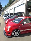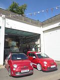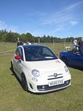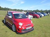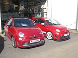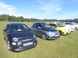 The vast majority of cars here were the 500-based models which have been on sale now since the end of 2008, following a launch at the Paris Show that year. Since that time there have been a number of detailed changes to the standard cars and a lot of limited editions. Those who really know the marque can spot most of them, but some are so subtle that unless there is a badge you can see, you will not be quite sure which version you are looking at. It used to be relatively easy, when the model was first launched, as there was only one version as shipped ex works called the 500. It had a 135 bhp 1.4 litre turbo-charged engine coupled to a five speed manual gearbox, with 16″ alloys as standard, and the option of 17″ wheels, and a colour palette comprising of two whites (BossaNova White, the standard colour, or the pearlescent Funk White), Red (Pasadoble), Pale Grey (Campovolo) or Black. If you wanted more power – 160 bhp – then you could order an Esseesse kit, which came in a large wooden crate, containing new wheels, springs, an ECU upgrade, the Monza exhaust system and badging. It was dealer fitted and could be applied at any time within the first 12 months or 10,000 miles from registration. Needless to say, it proved popular. As were many of the optional extras, with stickers for the sides, a large scorpion for the bonnet and even a chequered pattern for the roof among the personalisation options offered. Of the earliest cars here, there was the 500 Esseesse belonging to Richard and Mandy Newland, the somewhat modified/personalised Pasadoble Red car of Paul Hatton and David Robinson’s car which is a Series 1 car even though he has made some of the visual changes which were introduced on later factory models.