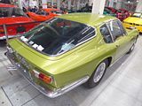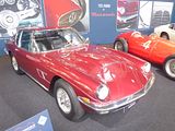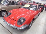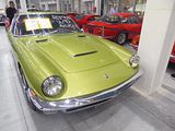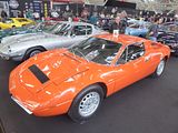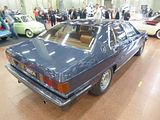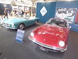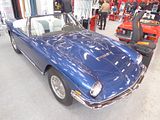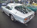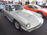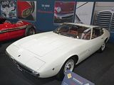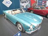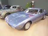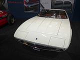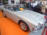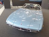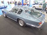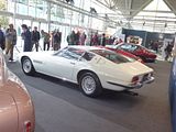 There were a couple of the very pretty Ghibli model – the first of three very different models to bear the name – on dealer stands. First unveiled in prototype form on the Maserati stand at the November 1966 Turin Motor Show, this grand tourer with an all steel body, characterised by a low, shark-shaped nose, was designed by a young Giorgetto Giugiaro, then working at Carrozzeria Ghia. Deliveries started in March of the following year. While the 1966 Ghia prototype was a two-seater, on the production car two emergency rear seats were added—consisting of nothing more than a cushion without backrest—and the Ghibli was marketed as a 2+2, though everyone tends to think of this car as a 2 seater, and the later Indy as the real 2+2 from the range. The first Ghibli cars were powered by a front placed quad-cam 4.7 litre dry sump V8 engine that prodiuced 306 bhp, mated to a five-speed manual or, on request, to a three-speed automatic transmission. It had a 0-60 mph time of 6.8 seconds, a top speed of 250 km/h (155 mph). The car also featured pop-up headlamps, leather sport seats and alloy wheels. A convertible version, the Ghibli Spyder, went into production in 1969. Its convertible top folded away under a flush fitting body-colour tonneau cover behind the front seats; thus the Spyder eschewed any vestigial rear passenger accommodation, and was a strict two-seater. A removable hard top was available as an option. The 4.9-litre Ghibli SS was released later in 1969. Its V8 engine was stroked 4 mm to displace 4930 cc, and put out 330 bhp; its top speed of 280 km/h (174 mph) made it the fastest Maserati road car ever produced. In all, 1,170 coupés and 125 Spyders (including 25 Spyder SS) were produced.