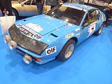 The A110 was introduced as an evolution of the A108. Like other road-going Alpines, the 1961 A110 used many Renault parts – including engines. But while the preceding A108 was designed around Dauphine components, the A110 was updated to use R8 parts. Unlike the A108, which was available first as a cabriolet and only later as a coupé, the A110 was delivered first with “Berlinetta” bodywork and then as a cabriolet. The main visible difference with the A108 coupé was a restyling of the rear body to fit the larger engine, which gave the car a more aggressive look. Like the A108, the A110 featured a steel backbone chassis with fibreglass body. The A110 was originally available with 1.1 litre R8 Major or R8 Gordini engines. The Gordini engine delivered 95 hp at 6,500 rpm. The A110 achieved most of its fame in the early 1970s as a victorious rally car. After winning several rallies in France in the late 1960s with iron-cast R8 Gordini engines the car was fitted with the aluminium-block Renault 16 TS engine. With two dual-chamber Weber 45 carburettors, the TS engine delivered 125 hp at 6,000 rpm. This allowed the production 1600S to reach a top speed of 210 km/h (130 mph). The longer wheelbase 2+2 Alpine GT4, originally considered a version of the A108, was updated with A110 engines and mechanicals, now being marketed as the “A110 GT4”. The car reached international fame during the 1970–1972 seasons when it participated in the newly created International Championship for Manufacturers, winning several events around Europe and being considered one of the strongest rally cars of its time. Notable performances from the car included victory in the 1971 Monte Carlo Rally with Swedish driver Ove Andersson. With the buy-out of Alpine by Renault complete, the International Championship was replaced by the World Rally Championship for 1973, at which time Renault elected to compete with the A110. With a team featuring Bernard Darniche, Jean-Pierre Nicolas and Jean-Luc Thérier as permanent drivers and “guest stars” like Jean-Claude Andruet (who won the 1973 Monte Carlo Rally) the A110 won most races where the works team was entered, making Alpine the first World Rally Champion. Later competition-spec A110s received engines of up to 1.8 litres. As well as being built at Alpine’s Dieppe factory, A110 models were constructed by various other vehicle manufacturers around the world. The Alpine A110 was produced in Mexico under the name “Dinalpin”, from 1965 to 1974, by Diesel Nacional (DINA), which also produced Renault vehicles. The Alpine A110 was also produced in Bulgaria under the name “Bulgaralpine”, from 1967 to 1969, by a cooperative formed between SPC Metalhim and ETO Bulet, whose collaboration also resulted in the production of the Bulgarrenault. In 1974 the mid-engined Lancia Stratos, the first car designed from scratch for rally racing, was operational and homologated. At the same time, it was obvious that the tail-engined A110 had begun reaching the end of its development. The adoption of fuel injection brought no performance increase. On some cars, a DOHC 16-valve head was fitted to the engine, but it proved unreliable. Chassis modification, like the use of an A310 double wishbone rear suspension, homologated with the A110 1600SC, also failed to increase performance. On the international stage, the Stratos proved to be the “ultimate weapon”, making the A110, as well as many other rally cars, soon obsolete. The A110 is still seen in events such as the Rallye Monte-Carlo Historique and there was a nice example here.