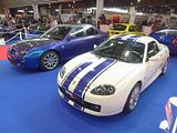 Unless you go back to the 1930s. when MG made a few high performance cars which had racing more in mind than road use, the only model to get anywhere supercar status that bears the famous roundel is the SV, and this was also represented here. This car came about after MG-Rover acquired Qvale of Italy. Taking the Qvale Mangusta as a base, a car which had been designed, but not quite made production, MG Rover allocated the project code X80 and set up a subsidiary company, MG X80 Ltd., to produce their new model. A big factor behind the project was that was seen as having the potential sales in the United States, as the Mangusta had already been homologated for the American market. The MG X80 was originally revealed as a concept car in 2001. However, the styling was considered too sedate, so when the production model, now renamed MG XPower SV, was eventually launched the following year, designer Peter Stevens had made the car’s styling more aggressive. The conversion from a clay model to a production car, including all requirements, was done in just 300 days by the Swedish company Caran. The production process was complex, partly caused by the use of carbon fibre to make the body panels. The basic body parts were made in the UK by SP Systems and then shipped to Belco Avia near Turin for assembly into body panels. These were then assembled into a complete body shell and fitted onto the box frame chassis and running gear and shipped to MG Rover’s Longbridge factory to be trimmed and finished. Several of the cars’ exterior and interior parts were borrowed from current and past Fiat models. The headlights, for example, were taken from a Punto Mk.2 and the rear lights borrowed from a Fiat Coupe. The goal had been to get a street price of under £100,000, and on launch, the base model came in well under that at £65,000, and even the uprated XPower SV-R model was priced at £83,000. Those were ambitious prices for a car bearing MG badges, though, so not surprisingly, sales were slow. It is understood that just 82 cars were produced excluding the 4 ‘XP’ pre-production prototypes. This included a few pre-production and show cars which were later dismantled, before production was stopped due to lack of sales. Most were sold to private owners, with the final ones being sold to customers in early 2008.