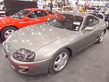 This Supra is from the fourth generation of the model, known as the A80. Design work began in February 1989 under various teams for design, product planning, and engineering. By the middle of 1990, a final A80 design concept from Toyota Technical Centre Aichi was approved and frozen for production in late 1990. The first test mules were hand-built in A70 bodies during late 1990, followed by the first A80 prototypes being hand-assembled in 1991. Again using subframe, suspension, and drivetrain assemblies from the Z30 Soarer (Lexus SC300/400), test model pre-production started in December 1992 with 20 models, and official mass production began in April 1993. This redesign saw Toyota placing great emphasis on a more serious high-performance car. The new Supra was completely redesigned, with rounded body styling and featured two new engines: a naturally aspirated Toyota 2JZ-GE producing 220 hp at 5800 rpm and 210 lb/ft at 4800 rpm of torque and a twin turbocharged Toyota 2JZ-GTE making 276 hp and 318 lb·ft of torque for the Japanese version. The styling, while modern, does seem to borrow some elements from Toyota’s first grand touring sports car, the Toyota 2000GT. For the export model (America/Europe) Toyota upgraded the Supra turbo’s engine which increased the power output to 320 hp at 5600 rpm and 315 lb/ft at 4000 rpm. The turbocharged variant could achieve 0–60 mph in as low as 4.6 seconds and 1/4-mile in 13.1 seconds at 109 mph. The turbo version was tested to reach over 285 km/h (177 mph), but the cars were restricted to just 180 km/h (112 mph) in Japan and 250 km/h (155 mph) elsewhere. The twin turbos operated in sequential mode, not parallel. Initially, all of the exhaust is routed to the first turbine for reduced lag. This resulted in boost and enhanced torque as early as 1800 rpm, where it already produced 300 lb/ft (410 Nm) of torque. At 3500 rpm, some of the exhaust is routed to the second turbine for a “pre-boost” mode, although none of the compressor output is used by the engine at this point. At 4000 rpm, the second turbo’s output is used to augment the first turbo’s output. Compared to the parallel mode, sequential mode turbos provide quicker low RPM response and increased high RPM boost. This high RPM boost was also aided with technology originally present in the 7M-GE in the form of the Acoustic Control Induction System (ACIS) which is a way of managing the air compression pulses within the intake piping as to increase power. For this generation, the Supra received a new 6-speed Getrag/Toyota V160 gearbox on the turbo models while the naturally aspirated models made do with a 5-speed manual W58, revised from the previous version. Each model was offered with a 4-speed automatic with manual shifting mode. All vehicles were equipped with 5-spoke aluminium alloy wheels, the naturally aspirated model had 16″ rims and the turbo models were 17″. The difference in wheel size was to accommodate the larger brakes equipped as standard onto the turbo model, but in Japan were optional extras. Both models had a space saver spare tire on a steel rim to save both space and weight. Toyota took measures to reduce the weight of this new model. Aluminium was used for the hood, targa top (when fitted), front crossmember, oil and transmission pans, and the suspension upper A-arms. Other measures included hollow carpet fibres, magnesium-alloy steering wheel, plastic gas tank and lid, gas injected rear spoiler, and a single pipe exhaust. Despite having more features such as dual airbags, traction control, larger brakes, wheels, tyres, and an additional turbo, the car was at least 200 lb lighter than its predecessor. The base model with a manual transmission had a curb weight of 3,210 lb (1,460 kg). The Sport Roof added 40 lb while the automatic transmission added 55 lb. It had a 51:49 (front:rear) weight distribution. The turbo model weighed 3,450 lb (1,560 kg) for the manual, automatic added another 10 lb (4.5 kg). Weight distribution was 53% front/47% rear. The Supra was heavier than the spartan Mazda RX-7 and all aluminium bodied Acura/Honda NSX, but it was lighter than the Mitsubishi 3000GT VR-4. The Supra soon became something of a legend, establishing itself as an effective platform for drifting in Japan, and for roadracing, with several top 20 and top 10 One Lap of America finishes in the SSGT1 class. Despite its curb weight, in 1994 the A80 managed remarkable skidpad ratings of 0.95 lateral g’s (200 ft) and 0.98 lateral g’s (300 ft), and the car has proved popular even as it ages in the UK, with several “grey market” cars having been brought here over the years.