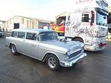 Chevrolet replaced the entire range of cars for 1955, producing what are sometimes referred to as the “Tri-Five” range, which would live for three years. Revolutionary in their day, they spawned a cult following that exists in clubs, website and even entire businesses that exclusively cater to the enthusiasts of the Tri Five automobiles. All featured a front-engine, rear-wheel-drive layout. They remain some of the most popular years for collectors and hot rodders. 1955-1957 were watershed years for Chevrolet, who spent a million dollars in 1956 alone for retooling, in order to make their less expensive Bel Air models look more like a Cadillac, culminating in 1957 with their most extravagant tailfins and Cadillac inspired bumper guards. In 1955, Americans purchased 7.1 million new automobiles, including 1.7 million Chevrolets, giving the company fully 44% of the low-price market and surpassing Ford in total unit sales by 250,000. The Bel Air was an instant hit with consumers, with Base One-Fifty models starting under $1600 and featuring a six cylinder engine. The introduction of the new optional 170 hp 265ci V8, coupled with the Powerglide automatic transmission quickly earned the model the nickname “The Hot One”. In the first year of production, the oil filter was considered an option, although not having it led to significantly shorter engine life. With three basic model lines of 150, 210 and Bel Air and a range of body styles from 2 and 4 door Sedans to Coupes, Convertibles and Wagons, there were as many as 19 different Tri-five models available. The 1956 cars saw minor changes to the grille, trim and other accessories. It meant huge gains in sales for Chevrolet, who sold 104,849 Bel Air models, due in part to the new V8 engine introduced a year before. By this time, their 265cid V8 had gained popularity with hot rodders who found the engine easy to modify for horsepower gains. This wasn’t lost on Chevrolet’s engineers, who managed to up the horsepower in 1956 from 170 hp to 225 hp with optional add-ons. The average two door Bel Air in 1956 sold for $2100, which was considered a good value at the time. Prices ranging from $1665 for the 150 sedan with six cylinder engine to $2443 for the V8 equipped convertible, with Nomad models running slightly higher. Bigger changes came for 1957, including the large tailfins, “twin rocket” bonnet design, even more chrome, tri-colour paint and a choice from no less than seven different V8 engines. While in 1957, Ford outsold Chevrolet for the first time in a great while, years later the used 1957 Chevrolets would sell for hundreds more than their Ford counterparts. As the horsepower race continued, Chevrolet introduced a new version of their small block, with 283 cubic inches of displacement and 245 hp. They also introduced a limited number of Rochester fuel injected 283 engines that produced 283 hp, the first production engine to achieve 1 hp per cubic inch. For all intent and purposes, this made the 1957 Bel Air a “hot rod”, right off the production line. It was available with manual transmission only. The base 265cid engine saw an increase from 170 to 185 hp as well. While not as popular as the previous year’s offering, Chevrolet still managed to sell 1.5 million cars in 1957. Today, a 1957 Chevrolet Bel Air like this one is one of the most sought after collector cars ever produced. Seen here was the rather special 56 Nomad of Pop Bodalia which is far from standard – Pip has fitted a supercharger to give this car a lot more urge and a fabulous engine note.