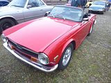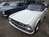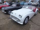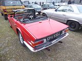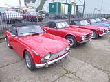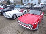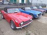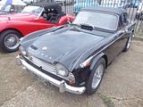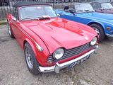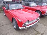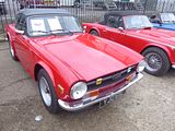 Also here was the TR4. Successor to the TR3a, and code named “Zest” during development, the TR4 was based on the chassis and drivetrain of the previous TR sports cars, but with a modern Michelotti styled body. The TR 4 engine was carried over from the earlier TR2/3 models, but the displacement was increased from 1991cc to 2138 cc by increasing the bore size. Gradual improvements in the manifolds and cylinder head allowed for some improvements culminating in the TR4A model. The 1991 cc engine became a no-cost option for those cars destined to race in the under-two-litre classes of the day. Some cars were fitted with vane-type superchargers, as the three main bearing engine was liable to crankshaft failure if revved beyond 6,500 rpm; superchargers allowed a TR4 to produce much more horse-power and torque at relatively modest revolutions. The standard engine produced 105 bhp but, supercharged and otherwise performance-tuned, a 2.2-litre I4 version could produce in excess of 200 bhp at the flywheel. The TR4, in common with its predecessors, was fitted with a wet-sleeve engine, so that for competition use the engine’s cubic capacity could be changed by swapping the cylinder liners and pistons, allowing a competitor to race under different capacity rules (i.e. below or above 2 litres for example). Other key improvements over the TR3 included a wider track front and rear, slightly larger standard engine displacement, full synchromesh on all forward gears, and rack and pinion steering. In addition, the optional Laycock de Normanville electrically operated overdrive Laycock Overdrive could now be selected for 2nd and 3rd gear as well as 4th, effectively providing the TR4 with a seven-speed manual close ratio gearbox. The TR4 was originally fitted with 15×4.5″ disc wheels. Optional 48-lace wire wheels could be ordered painted the same colour as the car’s bodywork (rare), stove-enamelled (matte silver with chrome spinners, most common) or in matte or polished chrome finishes (originally rare, but now more commonly fitted). The most typical tyre originally fitted was 590-15 bias ply or optional radial tires. In the US at one point, American Racing alloy (magnesium and aluminium) wheels were offered as an option, in 15×5.5″ or 15×6″ size. Tyres were a problem for original owners who opted for 60-spoke wire wheels, as the correct size radial-ply tyre for the factory rims was 155-15, an odd-sized tyre at the time only available from Michelin at considerable expense. Some original TR4 sales literature says the original radial size was 165-15. The much more common 185-15 radials were too wide to be fitted safely. As a result, many owners had new and wider rims fitted and their wheels re-laced. The new TR4 body style did away with the classical cutaway door design of the previous TRs to allow for wind-down windows (in place of less convenient side-curtains), and the angular rear allowed a boot with considerable capacity for a sports car. Advanced features included the use of adjustable fascia ventilation, and the option of a unique hard top that consisted of a fixed glass rear window (called a backlight) with an integral rollbar and a detachable, steel centre panel (aluminium for the first 500 units). This was the first such roof system on a production car and preceded by 5 years the Porsche 911/912 Targa, which has since become a generic name for this style of top. On the TR4 the rigid roof panel was replaceable with an easily folded and stowed vinyl insert and supporting frame called a Surrey Top. The entire hard top assembly is often mistakenly referred to as a Surrey Top. In original factory parts catalogues the rigid top and backlight assembly is listed as the Hard Top kit. The vinyl insert and frame are offered separately as a Surrey Top. Features such as wind-down windows were seen as a necessary step forward to meet competition and achieve good sales in the important US market, where the vast majority of TR4s were eventually sold. Dealers had concerns that buyers might not fully appreciate the new amenities, therefore a special short run of TR3As (commonly called TR3Bs) was produced in 1961 and ’62. The TR4 proved very successful and continued the rugged, “hairy-chested” image that the previous TRs had enjoyed. 40,253 cars were built during production years. Most were sold new to the US, but plenty have returned, and it is estimated that there are not far short of 900 examples of the model in the UK at present.
