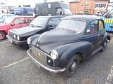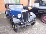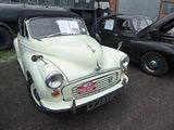 Oldest of the Morris cars seen here was this example of the Eight, which was produced from 1935 to 1948, inspired by the sales popularity of the similarly shaped Ford Model Y. The success of the car enabled Morris to regain its position as Britain’s largest motor manufacturer. The Eight was powered by a Morris UB series 918 cc four-cylinder side-valve engine with three bearing crankshaft and single SU carburettor with maximum power of 23.5 bhp. The gearbox was a three-speed unit with synchromesh on the top two speeds and Lockheed hydraulic brakes were fitted. Coil ignition was used in a Lucas electrical system powered by a 6 volt battery and third brush dynamo. The body which was either a saloon or open tourer was mounted on a separate channel section chassis with a 7 feet 6 inches wheelbase. The tourer could reach 58 mph and return 45 mpg; the saloons were a little slower. The chrome-plated radiator shell and honeycomb grille were dummies disguising the real one hidden behind. In September 1934 the bare chassis was offered for £95. For buyers of complete cars prices ranged from £118 for the basic two-seater to £142 for the four door saloon with “sunshine” roof and leather seats. Bumpers and indicators were £2 10 shillings (£2.50) extra. Compared with the similarly priced, but much lighter and longer established Austin 7, the 1934/35 Morris Eight was well equipped. The driver was provided with a full set of instruments including a speedometer with a built in odometer, oil pressure and fuel level gauges and an ammeter. The more modern design of the Morris was reflected in the superior performance of its hydraulically operated 8 inch drum brakes. The Morris also scored over its Ford rival by incorporating an electric windscreen wiper rather than the more old-fashioned vacuum powered equivalent, while its relatively wide 45 inch track aided directional stability on corners. The series I designation was used from June 1935 in line with other Morris models, cars made before this are known as pre-series although the official Morris Motors designation was by the model year even though they were introduced in October 1934. Of the 164,102 cars produced approximately 24,000 were tourers.