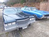 As with all GM full-size lines, the De Ville was completely redesigned for 1971. The new GM full-size bodies, at 64.3 inches (1,630 mm) front shoulder room (62.1 inches [1,580 mm] on Cadillac) and 63.4 inches (1,610 mm) rear shoulder room (64.0 inches [1,630 mm] on Cadillac) set a record for interior width that would not be matched by any car until the full-size GM rear-wheel-drive models of the early to mid-1990s. Pairs of individually housed squared-off headlamps were set wider apart. The V-shaped grille had an eggcrate style insert and was protected by massive vertical guards framing a rectangular license plate indentation. A wide hood with full-length windsplints, a prominent centre crease and hidden windshield wipers was seen. A Cadillac crest decorated the nose and new indicator lamps appeared atop each front fender. Horizontal beltline moulding ran from behind the front wheel housing, almost to the rear, stopping where an elliptical bulge in the body came to a point and where thin rectangular side markers were placed above and below the chrome strip. The rear wheel openings were again housed in fender skirts. Tail lamps were of the same type as before but were no longer divided by a chrome bar. Long horizontal back-up lamps were set in the bumper, on either side of a deeply recessed license plate housing. DeVilles were set apart visually by thin bright metal rocker panel steps and signature script on the front fenders bearing the series name. The bottoms of the rear fenders were decorated with a bright metal beauty panel that was wider than the rocker panel strips and blended into the molding running along the bottom of the fender skirt. The standard engine remained the 472, however, in line with GMs edict for all engines to run on unleaded fuel, the compression ratio was lowered from 10:1 to 8.5:1, reducing the SAE gross horsepower from 375 to 345. Torque dropped from 525 lb/ft (712 Nm) to 500 lb/ft (680 Nm). Interiors were redesigned, featuring a new curved instrument panel and new seating configurations. A rear “lamp monitor”, a fiber-optic system which monitored the taillamps, turn signals and brake lights, was new and positioned on the shelf behind the rear seat. In November 1971, a showroom-stock 1971 Coupe de Ville placed third in the annual coast-to-coast Cannonball Run, posting the highest average speed of the event, 84.6 mph (136.2 km/h) (excluding stops) and averaging 8.9 mpg‑US (26 L/100 km; 10.7 mpg‑imp). In 1972, a modest frontal revision placed more emphasis on horizontal grille blades. The parking lamps were moved from the bumper to between the square bezeled headlamps, which were now set wider apart. V-shaped emblems made a return on hood and deck lid. New standard features included a bumper impact system, automatic parking brake release, passenger assist straps and flow through ventilation system. New De Ville signature script was affixed to the sides of the rear roof panels. Sales reached a record 194,811. New energy absorbing bumpers were seen on all GM cars in 1973 and it brought styling refinements to De Ville. Grilles were widened and had an intricate eggcrate design. Larger vertical rectangles housed the parking lamps between wide spaced headlamps which had square bezels but round lenses. Bumpers ran fully across the front and wrapped around each end. Vertical guards were spaced much further apart at a point outboard of the grille. The rear end had a bumper with a flatter upper section housing an angled license plate recess. Border outline moldings vertically “veed” paralleled the fender edge shape at the rear bodysides. Single horizontally mounted rectangular rear side marker lamps were placed over and under the rear tip of the thin beltline trim. Cadillac script was seen on the front fender sides below the belt molding behind the wheel opening. Inside, “soft-pillow” door panels with larger, sturdier pull-straps were new. The rear “lamp monitor” was repositioned from the rear seat shelf to the headliner just above the rear window. An Illuminated vanity mirror was an available option. This was the final year for hardtop Coupe de Villes. Sales set a new record at 216,243. In 1974, a wide eggcrate grille was used. Dual round headlamps were mounted close together in square bezels. Further outboard were double deck wraparound parking lamps. Shorter vertical grille guards appeared in about the same position as before. Rear fendersides were flatter without the elliptical bulge. The thin beltline molding was positioned lower by several inches. The rear end had vertical bumper ends with integrated side marker lights. New taillamps were positioned horizontally beneath the trunk lid. Both bumpers, especially the rear, protruded further from the body. Unlike the other “C” body GM coupes, the Coupe de Ville was no a longer true hardtop, instead sporting large wide “coach” windows giving a thick center pillar look. They retained their frameless door glass, however. The Sedan de Ville continued as a true hardtop however, and would remain so until the 1977 model. A new curved, two-tiered instrument panel housed a new quartz controlled digital clock. New standard features included an integral litter container. A Space Saver spare tire was standard when DeVilles were ordered with optional white sidewall steel belted radial tyres. 1974 also saw the introduction of the optional “Air Cushion Restraint System”. One of the first production examples of what are now more commonly called airbags, this option provided protection for front seat occupants in the case of a frontal collision. One bag was located in the steering wheel, the other in the dashboard in front of the front seat passenger. The glove box was replaced with a lockable storage compartment under the dashboard. The option was expensive and therefore unpopular with customers and was discontinued after the 1976 model year. Cadillac would not offer airbags again until the 1990 model year.