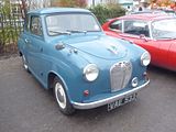 By the mid 1950s, the BMC organisation was well established, and it dominated the UK market with a 39% share. Plans were made for a complete new range of cars that would encompass all the marques: Austin, Morris, MG, Riley and Wolseley. Italian stylist Pininfarina was commissioned to design them. The first model to appear was the A40 which was launched in October 1958 at the London Motor Show. Although it is frequently referred to as the A40 Farina, it was only ever badged as the A40. It was only ever sold with Austin badging. At a time when Turin auto-design studios were, for the most part, consulted only by builders of expensive “exotic” cars, Austin made much of the car’s Italian styling, with both “Pinin” Farina and his son Sergio being present at the car’s UK launch. As would become apparent in later years, the car was something of a scaled-down version of the forthcoming Austin Cambridge and Morris Oxford, but without an extended boot. The A40 Farina was intended to replace the Austin A35, from which it inherited much of its running gear, and was a capacious thoroughly modern small car, with a brand new distinctive “two box” shape and generous headroom in the back seat. It was a saloon, the lower rear panel dropped like a then conventional bootlid, the rear window remaining fixed. The Countryman hatchback appeared exactly a year later in October 1959, and differed from the saloon in that the rear window was marginally smaller, to allow for a frame that could be lifted up, with its own support, while the lower panel was now flush with the floor and its hinges had been strengthened It was effectively a very small estate car with a horizontally split tailgate having a top-hinged upper door and bottom-hinged lower door. October 1959 also saw the standardisation on both cars of self-cancelling indicators and the provision of a centre interior light and, in early summer 1960, a flat lid was added over the spare wheel in the rear luggage compartment. At launch the car shared the 948 cc A-Series straight-4 used in other Austins including its A35 predecessor. The suspension was independent at the front using coil springs with a live axle and semi elliptic leaf springs at the rear. The drum brakes were a hybrid (hydromech) arrangement, hydraulically operated at the front but cable actuated at the rear. The front drums at 8 in were slightly larger than the 7 in rears. Cam and peg steering was fitted. Individual seats were fitted in the front, with a bench at the rear that could fold down to increase luggage capacity. The trim material was a vinyl treated fabric. Options included a heater, radio, windscreen washers and white-wall tyres. The gearchange lever was floor-mounted with the handbrake between the seats. The door windows were not opened by conventional winders, but pulled up and down using finger grips; a window lock position was on the door handle. An A40 Farina Mark II was introduced in 1961. It had a 3.5 in longer wheelbase to increase the space for passengers in the back seats, and the front grille and dashboard were redesigned. The Mark II had more power – (37 hp – and an SU replaced the previous Zenith carburettor but was otherwise similar mechanically. An anti-roll bar was fitted at the front. The 948 cc engine was replaced in the autumn of 1962 by a larger 1098 cc version with an output of 48 bhp. The A40 shared this engine with the Morris Minor, which was also rear-wheel drive – both models retaining the traditional north-south engine layout – and also with the recently introduced front-wheel drive, transverse-engined Morris 1100. An improved gearbox was fitted to the A40 at the same time. Further changes were minimal. However, in 1964 a new fascia with imitation wood veneer covering was fitted, the brakes also became fully hydraulic, replacing the semi cable operated rear system that the Mark I had inherited from the A35. Nevertheless, the introduction at the end of 1962 of the similarly sized Morris 1100, followed by an Austin-badged counterpart a year later, left the A40 looking cramped on the inside and outclassed in terms of road holding and ride; sales of the A40 Mark II progressed at a slower rate than had been achieved by the Mark I It remained in production until 1967.