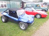 The Meyers Manx dune buggy is a small recreationally-oriented automobile, designed initially for desert racing by Californian engineer, artist, boat builder and surfer Bruce F. Meyers. It was produced by his Fountain Valley, California company, B. F. Meyers & Co. from 1964 to 1971, in the form of car kits applied to shortened chassis of Volkswagen Beetles. The car line dominated dune racing in its time, breaking records immediately, and was eventually also released in street-oriented models, until the company’s demise due to tax problems after Meyers’s departure. New vehicles inspired by the original Manx buggy have been produced by Meyers’s re-founded operation, Meyers Manx, Inc., since 2000. The name and cat logo of the brand derives from the Manx cat, by virtue of the tailless breed’s and the shortened vehicle’s truncated “stubbiness”. Drawing on his experience in sailboat construction, Meyers modeled and built his first dune buggy, “Old Red”, a shortened VW Beetle with a monocoque, fiberglass shell and Chevrolet pickup truck (trailing arm style) suspension, in late 1963 to May 1964 in his garage in Newport Beach, California. The first known street-legal fiberglass dune buggy, it featured a unibody shell that fused body, fenders and frame, retaining just the engine, transmission and other mechanicals of the VW, and with no top and no hood. The use of compound curves throughout provided great rigidity. The fenders were arched high, to make room for large, knobby dirt-racing wheels. The “Manx” name for the shortened, taller-wheeled, more maneuverable VW Beetle mods refers to and derives from the comparably stubby Manx cat breed, colloquially called “stubbins”; they are short-spined and stub-tailed-to-tailless, long-legged, and known for their turning ability while chasing. The Meyers Manx logo prominently features a Manx cat. The tailless cat in the logo, as featured on the hood ornament, is stylized after a passant heraldic lion, its right forepaw brandishing a sword. The name also suggests racing fitness, as the already globally renowned, British-manufactured Norton Manx motorcycle dominated the Isle of Man TT, Manx Grand Prix and other Isle of Man-based (i.e. Manx) international races from the 1940s to the early 1970s. The Meyers Manx has no direct connection to the Isle of Man. Meyers produced kits later in 1964 and into 1965, marketed under the name Meyers Manx. Although this early design was critically acclaimed, even featured on the April 1967 cover of Car & Driver magazine, and drew much attention, it proved too expensive to be profitable; ultimately only 12 kits of the monocoque Manx were produced. Meyers and a friend (both amateur racers) broke by over four hours the Ensenada – La Paz run’s record of 39 hours, until then held by a pro racer. According to James Hale, compiler of the Dune Buggy Handbook, this feat ushered in an era of Meyers Manx “domination in off-road events … and the formation of NORRA (National Off-Road Racing Association)”. The commercially manufactured Meyers Manx Mk I featured an open-wheeled fiberglass bodyshell, coupled with the Volkswagen Beetle H4 flat-four engine (1.2 L, 1.3 L, 1.5 L and 1.6 L, in different models) and a modified, RR-layout Beetle frame. It is a small car, with a wheelbase 14¼ inches (36.2 cm) shorter than a Beetle automobile for lightness and better maneuverability. For this reason, the car is capable of very quick acceleration and good off-road performance, despite not being four-wheel drive. The usually street-legal car redefined and filled a recreational and competitive niche that had been essentially invented by the first civilian Jeep in 1945, and which was later to be overtaken by straddle-ridden, motorcycle-based all-terrain vehicles (introduced in 1970) and newer, small and sporty (but usually four-wheel-drive), off-road automobiles. The commercial Meyers Manx received widespread recognition when it defeated motorcycles, trucks and other cars to win the inaugural 1967 Mexican 1000 race (the predecessor of the Baja 1000). It crossed automotive press genre lines, being selected as the cover story in the August 1966 issue of Hot Rod magazine. Approximately 6,000 of the original Meyers Manx dune buggies were produced, but when the design became popular many copies (estimated at a quarter of a million worldwide) were made by other companies. Although already patented, Meyers & Co. lost in court to the copiers, the judge rescinding his patent as unpatentable, opening the floodgates to the industry Meyers started.[citation needed] Since then, numerous vehicles of the general “dune buggy” or “beach buggy” body type, some VW-based, others not, have been and continue to be produced. An early example was the Imp by EMPI (1968–1970), which borrowed stylistic elements from the Chevrolet Corvette but was otherwise Manx-like. A later 1970s Manx clone was the Dune Runner from Dune Buggy Enterprises in Westminster, California. The Meyers company attempted to stay ahead of this seemingly unfair competition with the release of the distinctive, and harder-to-copy, Meyers Manx Mk II design. B. F. Meyers & Co. also produced other Beetle-based vehicles, including the May 1970 Car & Driver magazine cover sporty Manx SR variant (street roadsters, borrowing some design ideas from the Porsche 914), the Meyers Tow’d (sometimes referred to as the “Manx Tow’d”, a non-street-legal racing vehicle designed to be towed to the desert or beach), the Meyers Tow’dster (a street-legal hybrid of the two, and Meyers Resorter a.k.a. Meyers Turista (a small recreational or “resort” vehicle inspired by touring motorcycles). The Manx SR2 was a modified SR that was only produced by later manufacturers including Karma Coachworks, Heartland Motors and Manx Motors of MD. While the Tow’d was a minimal off-road racer and the SR/SR2 was a showy roadster, the Tow’dster was a compromise between a dune-capable vehi