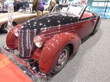This is a 1939 Steyr 220 Sport Roadster by Gläser. It is a rare classic car, one of an estimated six Sport Roadster models produced with hand-formed bodywork. The car features a black soft top, louvered hood side panels, and rear wheel spats. The three-place interior is upholstered in red leather with wood trim. The Gläser body is noted for its streamlined, elegant, and aerodynamic design.