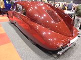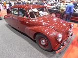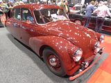 The Tatra 87 (T87) is a car built by Czechoslovak manufacturer Tatra from 1936 to 1950. It was powered by a rear-mounted 2.9-litre air-cooled 90-degree overhead cam V8 engine that produced 85 horsepower and could drive the car at nearly 100 mph (160 km/h). It is ranked among the fastest production cars of its time. Competing cars in this class, however, used engines with almost twice the displacement, and with fuel consumption of 20 litres per 100 km (11.8 mpg). Thanks to its aerodynamic shape, the Tatra 87 had a consumption of just 12.5 litres per 100 km (18.8 mpg). After the war, between 1950 and 1953, T87s were fitted with more modern 2.5-litre V8 T603 engines. The 87 was used by Hanzelka and Zikmund for their travel through Africa and Latin America from 1947 to 1950. The Tatra 87 has unique bodywork. Its streamlined shape was designed by Hans Ledwinka and Erich Übelacker and was based on the Tatra 77, the first car designed with aerodynamics in mind. The body design was based on proposals submitted by Paul Jaray of Hungarian descent, who designed the famous German Graf Zeppelin dirigibles. A fin in the sloping rear of the Tatra helps to divide the air pressure on both sides of the car, a technique used later in aircraft. Tatra 87 had a drag coefficient of 0.36 as tested in the VW tunnel in 1979, as well as a reading of 0.244 for a 1:5 model tested in 1941. Small sets of windows in the dividers between the passenger, luggage space, and engine compartments, plus louvres providing air for the air-cooled engine, allowed limited rear visibility. Its entire rear segment could be opened to service the engine. The front doors are rear-hinged coach doors, sometimes termed “suicide doors”, while the rear doors are front-hinged. Many design elements of the Tatra 87, V570, and the later T97, were copied by later car manufacturers. Ferdinand Porsche was heavily influenced by the Tatra 87 and T97 and the flat-four-cylinder engine in his design of the Volkswagen Beetle, and was subsequently sued by Tatra. The price new (in the 1940s) was 25,000 SFr. Its value today is around $125,000. A 1941 Tatra 87, owned and restored by Paul Greenstein and Dydia DeLyser of Los Angeles California, won a New York Times reader’s poll of collector’s cars in 2010, beating strong competition from 651 cars.