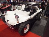 The Meyers Manx dune buggy is a small recreationally-oriented automobile, designed initially for desert racing by Californian engineer, artist, boat builder and surfer Bruce F. Meyers. It was produced by his Fountain Valley, California company, B. F. Meyers & Co. from 1964 to 1971, in the form of car kits applied to shortened chassis of Volkswagen Beetles. The car line dominated dune racing in its time, breaking records immediately, and was eventually also released in street-oriented models, until the company’s demise due to tax problems after Meyers’s departure. New vehicles inspired by the original Manx buggy have been produced by Meyers’s re-founded operation, Meyers Manx, Inc., since 2000. The name and cat logo of the brand derives from the Manx cat, by virtue of the tailless breed’s and the shortened vehicle’s truncated “stubbiness”. Drawing on his experience in sailboat construction, Meyers modeled and built his first dune buggy, “Old Red”, a shortened VW Beetle with a monocoque, fiberglass shell and Chevrolet pickup truck (trailing arm style) suspension, in late 1963 to May 1964 in his garage in Newport Beach, California. The first known street-legal fiberglass dune buggy, it featured a unibody shell that fused body, fenders and frame, retaining just the engine, transmission and other mechanicals of the VW, and with no top and no hood. The use of compound curves throughout provided great rigidity. The fenders were arched high, to make room for large, knobby dirt-racing wheels. The “Manx” name for the shortened, taller-wheeled, more maneuverable VW Beetle mods refers to and derives from the comparably stubby Manx cat breed, colloquially called “stubbins”; they are short-spined and stub-tailed-to-tailless, long-legged, and known for their turning ability while chasing. The Meyers Manx logo prominently features a Manx cat. The tailless cat in the logo, as featured on the hood ornament, is stylized after a passant heraldic lion, its right forepaw brandishing a sword. The name also suggests racing fitness, as the already globally renowned, British-manufactured Norton Manx motorcycle dominated the Isle of Man TT, Manx Grand Prix and other Isle of Man-based (i.e. Manx) international races from the 1940s to the early 1970s. The Meyers Manx has no direct connection to the Isle of Man. Meyers produced kits later in 1964 and into 1965, marketed under the name Meyers Manx. Although this early design was critically acclaimed, even featured on the April 1967 cover of Car & Driver magazine, and drew much attention, it proved too expensive to be profitable; ultimately only 12 kits of the monocoque Manx were produced. Meyers and a friend (both amateur racers) broke by over four hours the Ensenada – La Paz run’s record of 39 hours, until then held by a pro racer. According to James Hale, compiler of the Dune Buggy Handbook, this feat ushered in an era of Meyers Manx “domination in off-road events … and the formation of NORRA (National Off-Road Racing Association)”. The commercially manufactured Meyers Manx Mk I featured an open-wheeled fiberglass bodyshell, coupled with the Volkswagen Beetle H4 flat-four engine (1.2 L, 1.3 L, 1.5 L and 1.6 L, in different models) and a modified, RR-layout Beetle frame. It is a small car, with a wheelbase 14¼ inches (36.2 cm) shorter than a Beetle automobile for lightness and better maneuverability. For this reason, the car is capable of very quick acceleration and good off-road performance, despite not being four-wheel drive. The usually street-legal car redefined and filled a recreational and competitive niche that had been essentially invented by the first civilian Jeep in 1945, and which was later to be overtaken by straddle-ridden, motorcycle-based all-terrain vehicles (introduced in 1970) and newer, small and sporty (but usually four-wheel-drive), off-road automobiles. The commercial Meyers Manx received widespread recognition when it defeated motorcycles, trucks and other cars to win the inaugural 1967 Mexican 1000 race (the predecessor of the Baja 1000). It crossed automotive press genre lines, being selected as the cover story in the August 1966 issue of Hot Rod magazine. Approximately 6,000 of the original Meyers Manx dune buggies were produced, but when the design became popular many copies (estimated at a quarter of a million worldwide) were made by other companies. Although already patented, Meyers & Co. lost in court to the copiers, the judge rescinding his patent as unpatentable, opening the floodgates to the industry Meyers started.[citation needed] Since then, numerous vehicles of the general “dune buggy” or “beach buggy” body type, some VW-based, others not, have been and continue to be produced. An early example was the Imp by EMPI (1968–1970), which borrowed stylistic elements from the Chevrolet Corvette but was otherwise Manx-like. A later 1970s Manx clone was the Dune Runner from Dune Buggy Enterprises in Westminster, California. The Meyers company attempted to stay ahead of this seemingly unfair competition with the release of the distinctive, and harder-to-copy, Meyers Manx Mk II design. B. F. Meyers & Co. also produced other Beetle-based vehicles, including the May 1970 Car & Driver magazine cover sporty Manx SR variant (street roadsters, borrowing some design ideas from the Porsche 914), the Meyers Tow’d (sometimes referred to as the “Manx Tow’d”, a non-street-legal racing vehicle designed to be towed to the desert or beach), the Meyers Tow’dster (a street-legal hybrid of the two, and Meyers Resorter a.k.a. Meyers Turista (a small recreational or “resort” vehicle inspired by touring motorcycles). The Manx SR2 was a modified SR that was only produced by later manufacturers including Karma Coachworks, Heartland Motors and Manx Motors of MD. While the Tow’d was a minimal off-road racer and the SR/SR2 was a showy roadster, the Tow’dster was a compromise between a dune-capable vehi